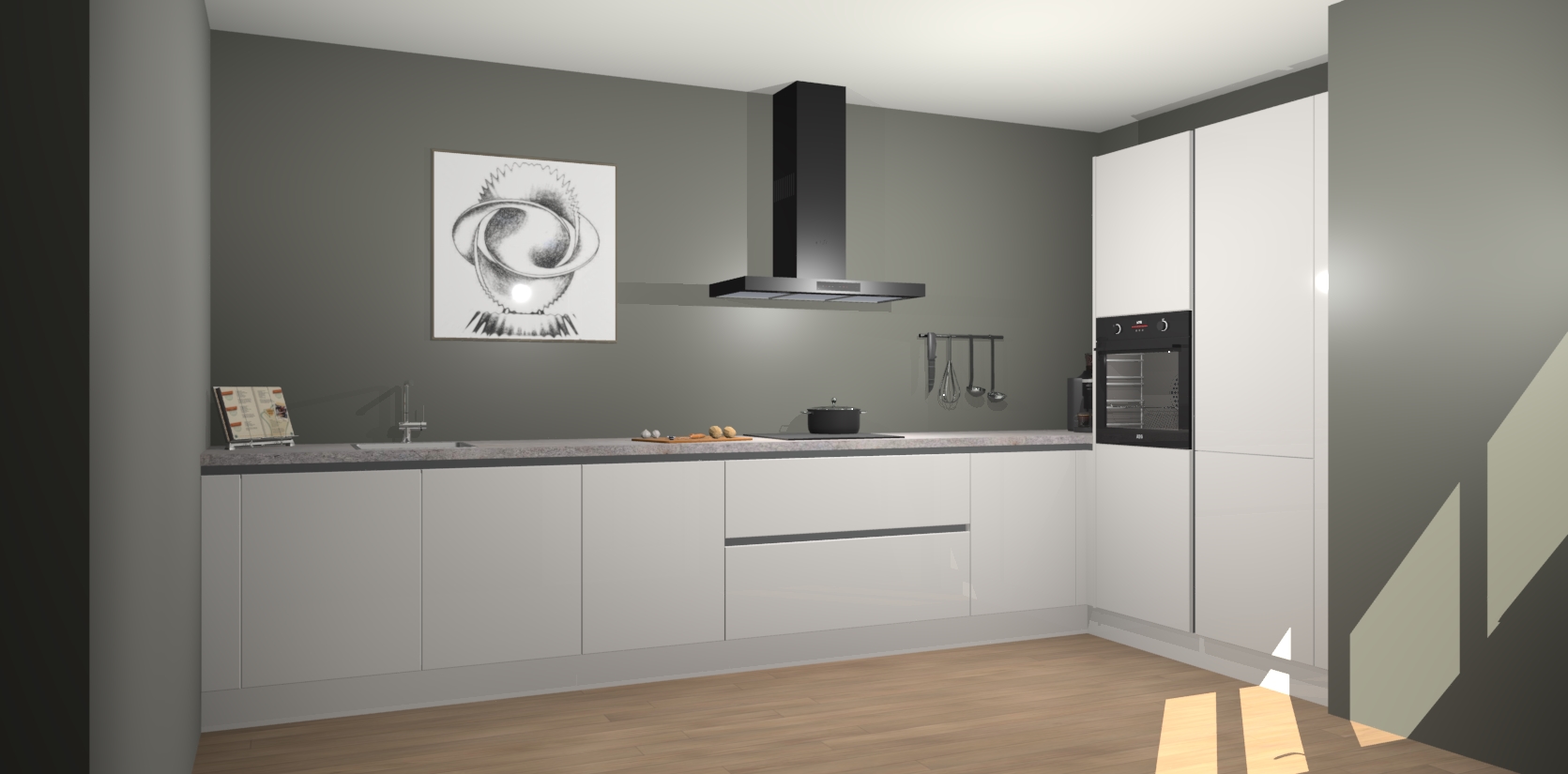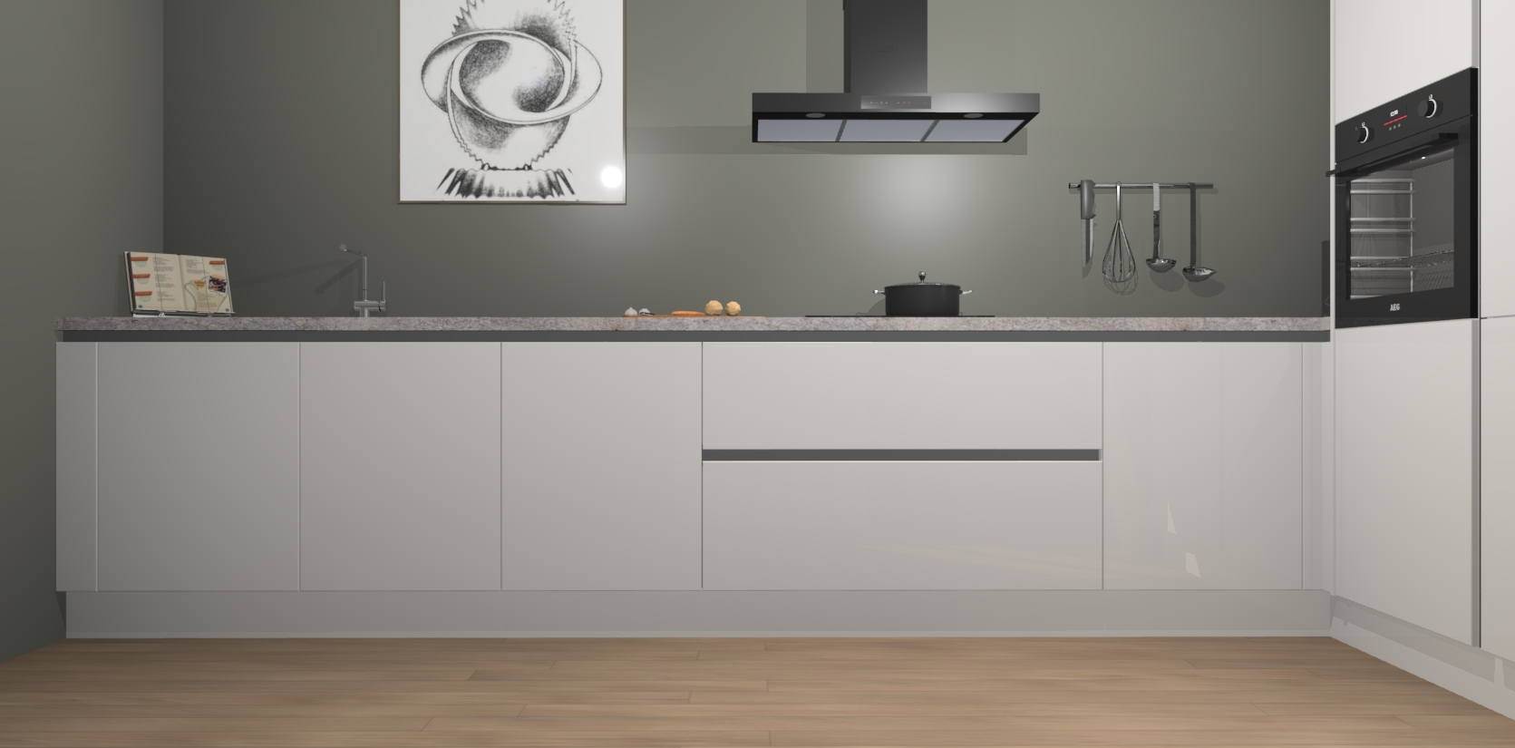 Welkom bij de Zijdegrijze hoogglans greeploze keuken Khao Lak. Deze prachtige keuken zal de komende jaren het middelpunt van de belangstelling in uw huis zijn. Uitgerust met vijf inbouwapparaten komt u nooit kookgereedschap tekort. Bovendien geeft de warme houtlook elke ruimte een uitnodigende en tijdloze uitstraling.