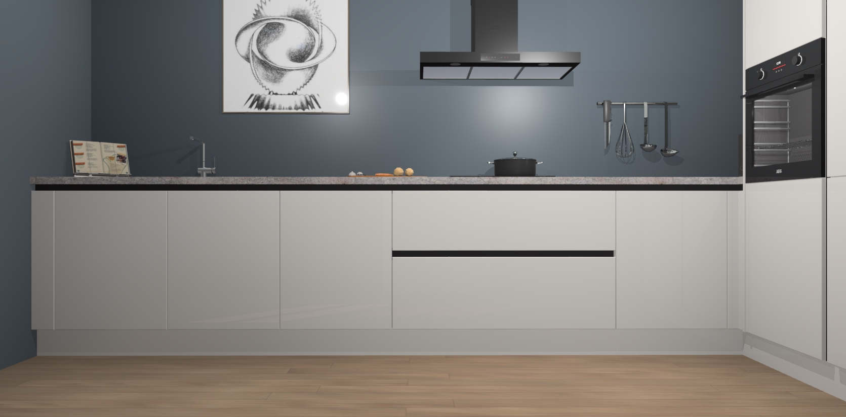 Welkom bij de Zijdegrijze hoogglans greeploze keuken Khao Lak. Deze prachtige keuken zal de komende jaren het middelpunt van de belangstelling in uw huis zijn. Uitgerust met vijf inbouwapparaten komt u nooit kookgereedschap tekort. Bovendien geeft de warme houtlook elke ruimte een uitnodigende en tijdloze uitstraling.