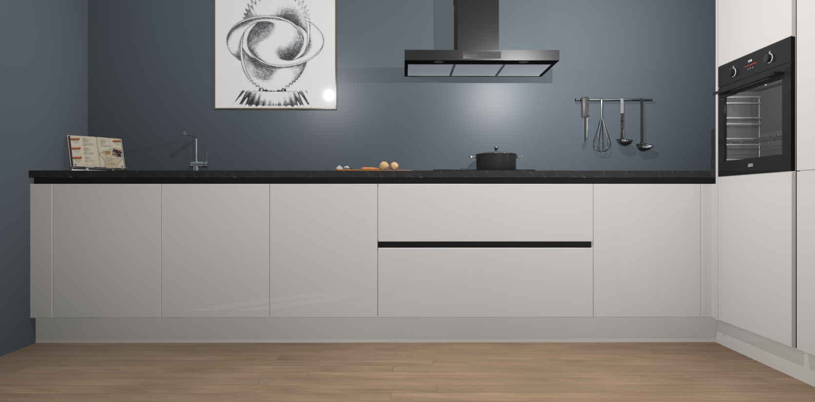 Welkom bij de Zijdegrijze hoogglans greeploze keuken Khao Lak. Deze prachtige keuken zal de komende jaren het middelpunt van de belangstelling in uw huis zijn. Uitgerust met vijf inbouwapparaten komt u nooit kookgereedschap tekort. Bovendien geeft de warme houtlook elke ruimte een uitnodigende en tijdloze uitstraling.