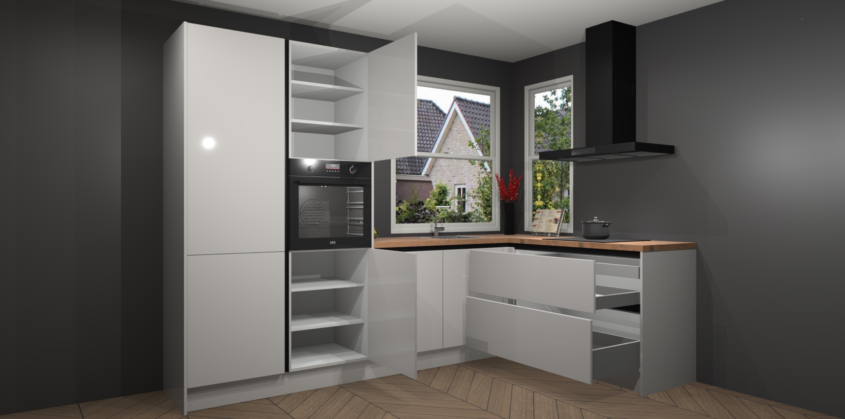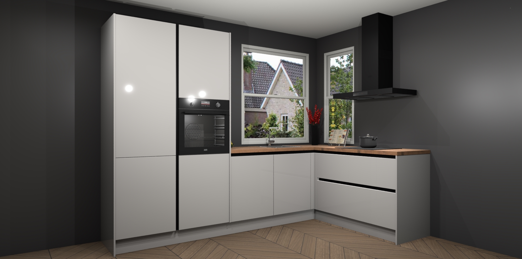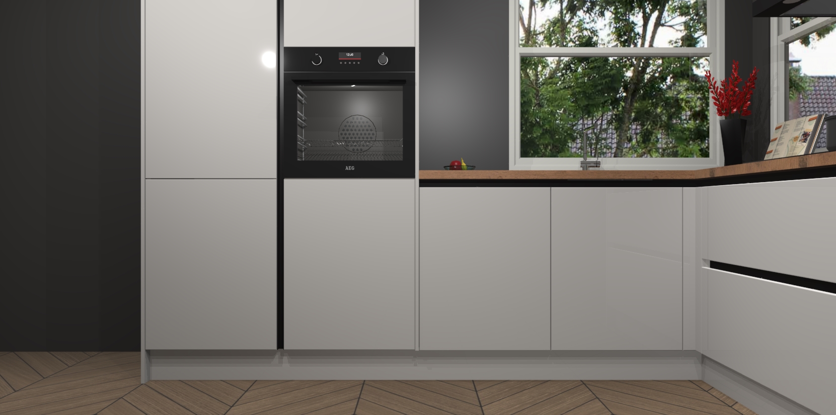 De Zijdegrijze hoogglans greeploze keuken Kotor wordt geleverd met vijf inbouwapparaten, waaronder een oven, inductiekookplaat, afzuigkap, vaatwasser en koelkast. En als u uw apparatuur wilt upgraden, kunnen we u na bestelling eenvoudig helpen overstappen naar AEG. Bovendien heeft deze keuken soft close deuren, zodat lades en kastjes geruisloos en zonder klepperen sluiten!