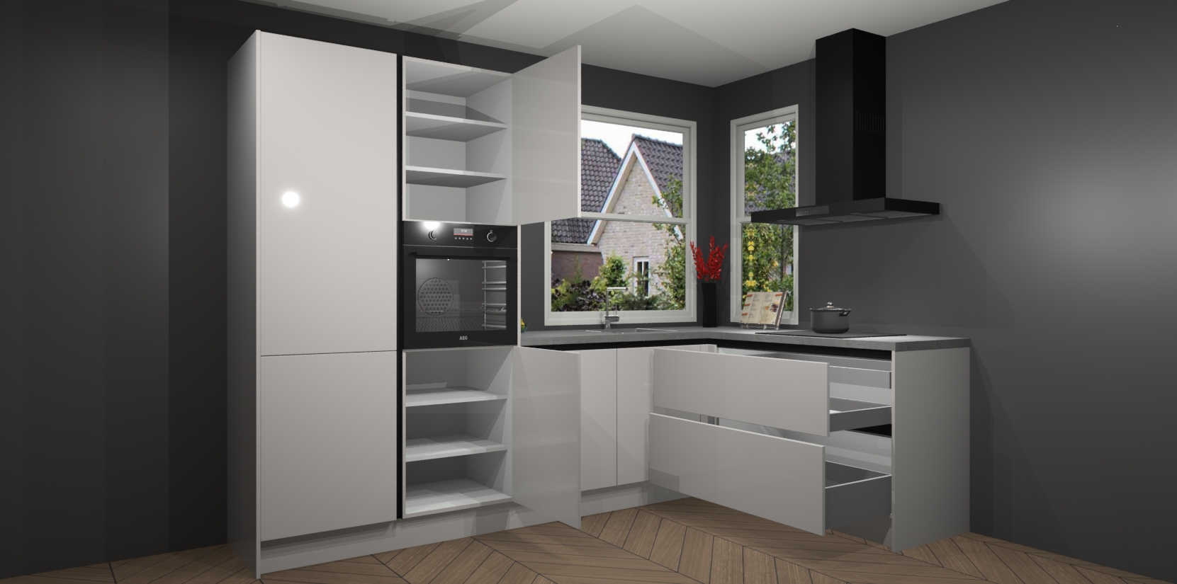 De Zijdegrijze hoogglans greeploze keuken Kotor wordt geleverd met vijf inbouwapparaten, waaronder een oven, inductiekookplaat, afzuigkap, vaatwasser en koelkast. En als u uw apparatuur wilt upgraden, kunnen we u na bestelling eenvoudig helpen overstappen naar AEG. Bovendien heeft deze keuken soft close deuren, zodat lades en kastjes geruisloos en zonder klepperen sluiten!