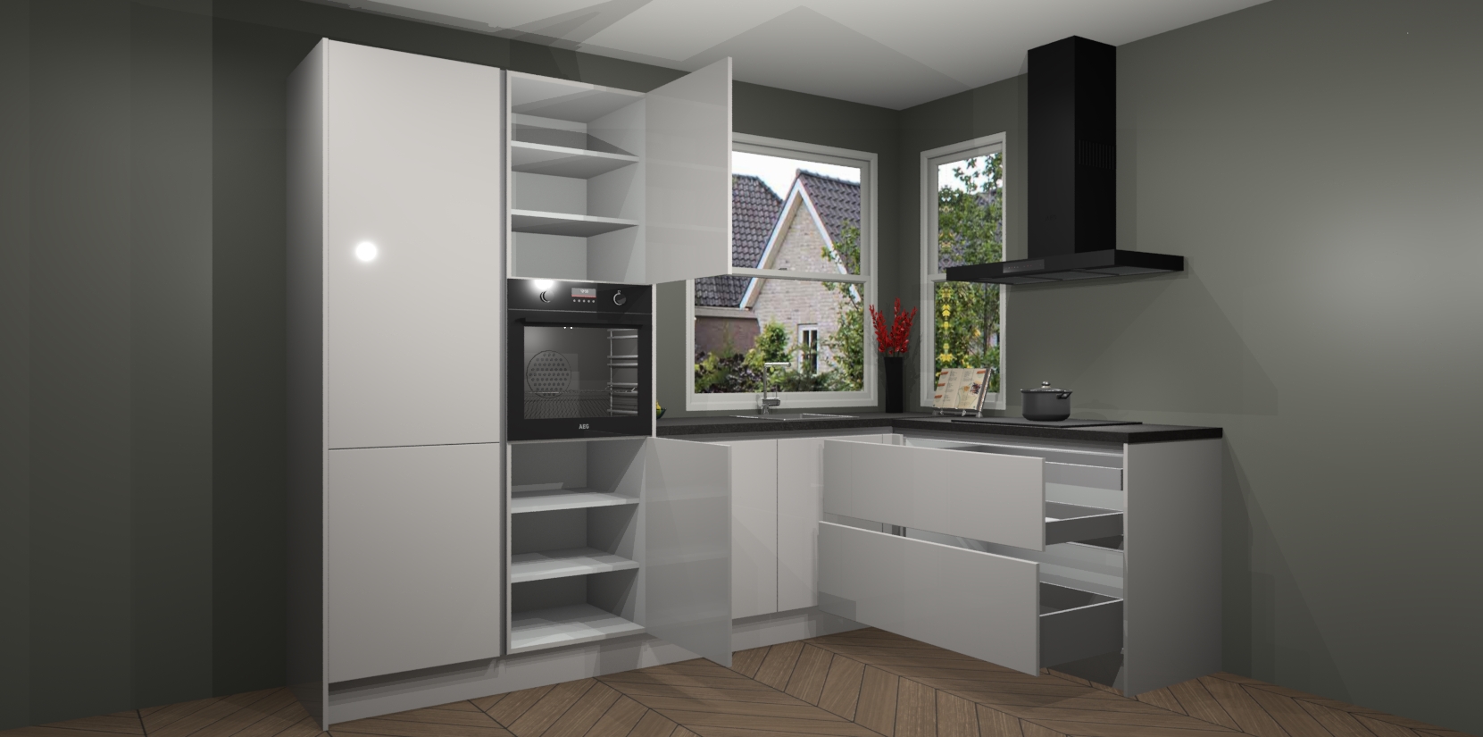 De Zijdegrijze hoogglans greeploze keuken Kotor wordt geleverd met vijf inbouwapparaten, waaronder een oven, inductiekookplaat, afzuigkap, vaatwasser en koelkast. En als u uw apparatuur wilt upgraden, kunnen we u na bestelling eenvoudig helpen overstappen naar AEG. Bovendien heeft deze keuken soft close deuren, zodat lades en kastjes geruisloos en zonder klepperen sluiten!