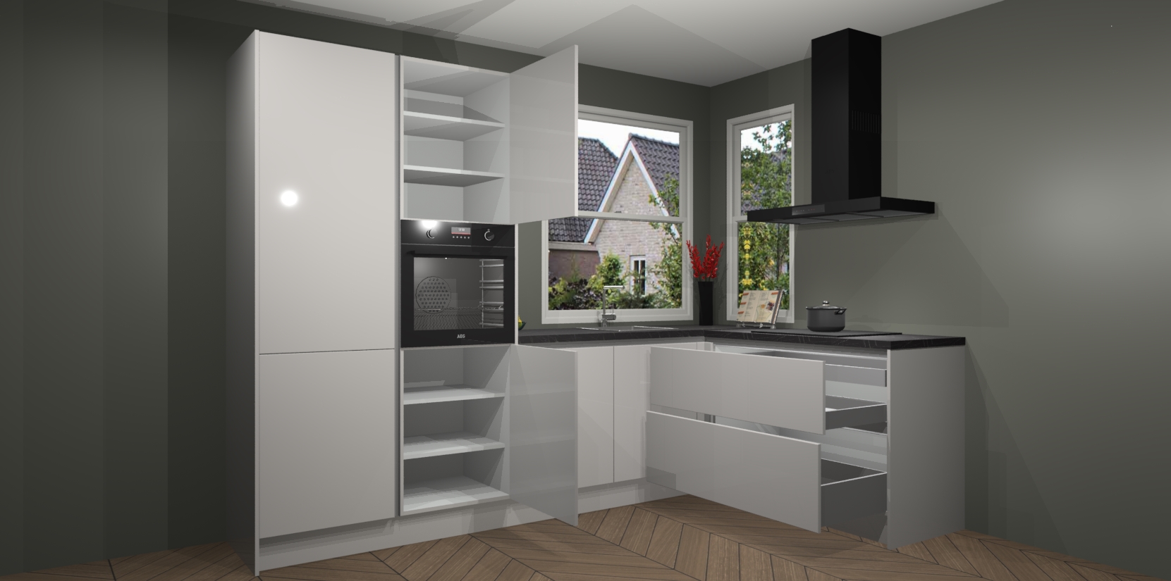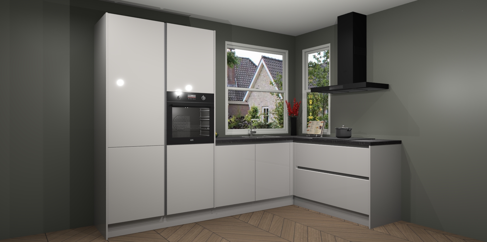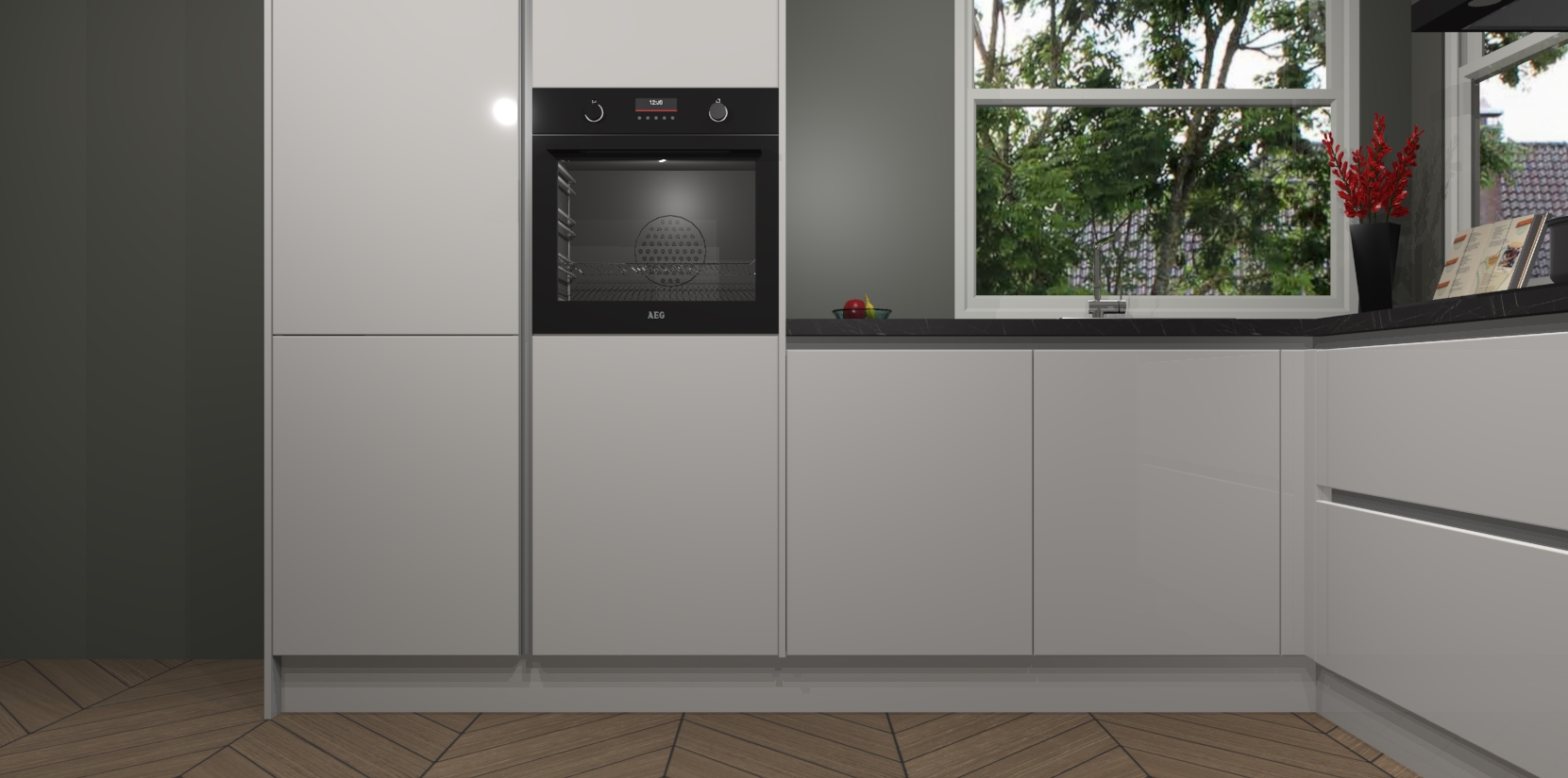 De Zijdegrijze hoogglans greeploze keuken Kotor wordt geleverd met vijf inbouwapparaten, waaronder een oven, inductiekookplaat, afzuigkap, vaatwasser en koelkast. En als u uw apparatuur wilt upgraden, kunnen we u na bestelling eenvoudig helpen overstappen naar AEG. Bovendien heeft deze keuken soft close deuren, zodat lades en kastjes geruisloos en zonder klepperen sluiten!
