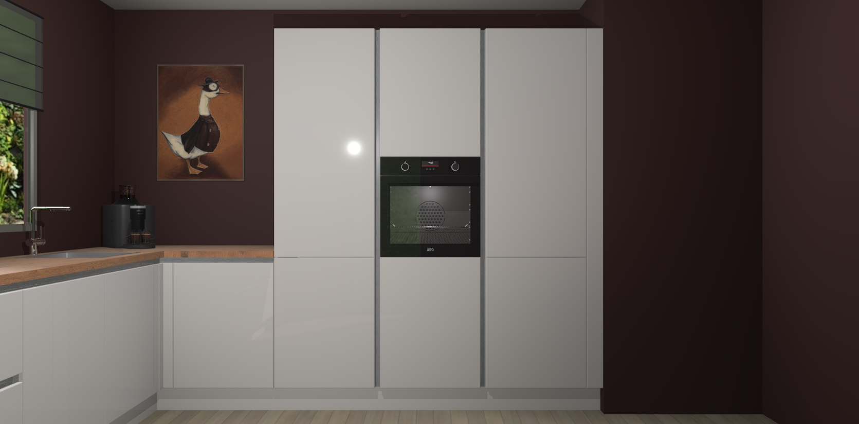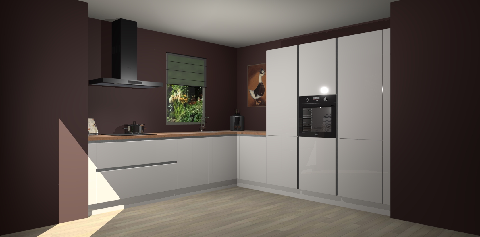 Welkom bij de Zijdegrijze hoogglans greeploze keuken Laos. Deze prachtige keuken zal de komende jaren het middelpunt van de belangstelling in uw huis zijn. Uitgerust met vijf inbouwapparaten komt u nooit kookgereedschap tekort. Bovendien geeft de warme houtlook elke ruimte een uitnodigende en tijdloze uitstraling.