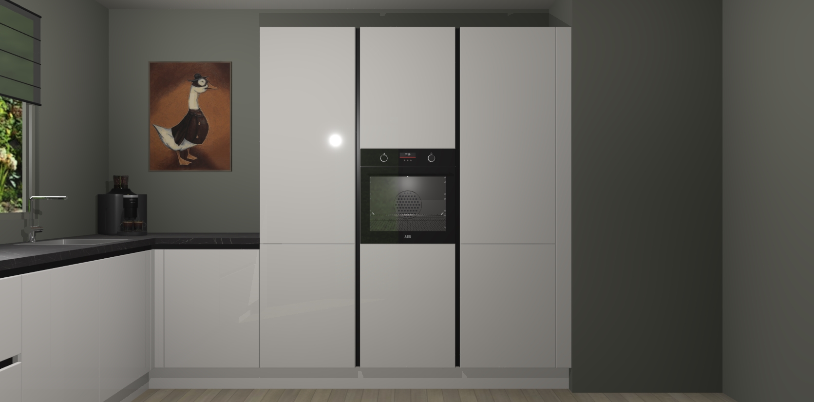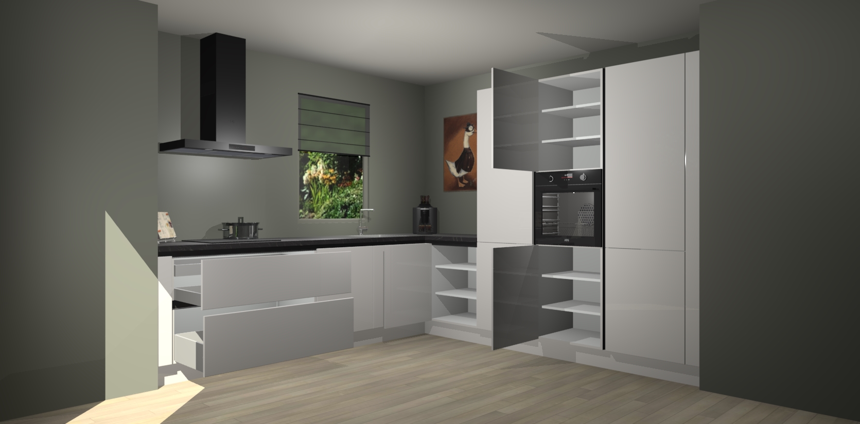 Welkom bij de Zijdegrijze hoogglans greeploze keuken Laos. Deze prachtige keuken zal de komende jaren het middelpunt van de belangstelling in uw huis zijn. Uitgerust met vijf inbouwapparaten komt u nooit kookgereedschap tekort. Bovendien geeft de warme houtlook elke ruimte een uitnodigende en tijdloze uitstraling.