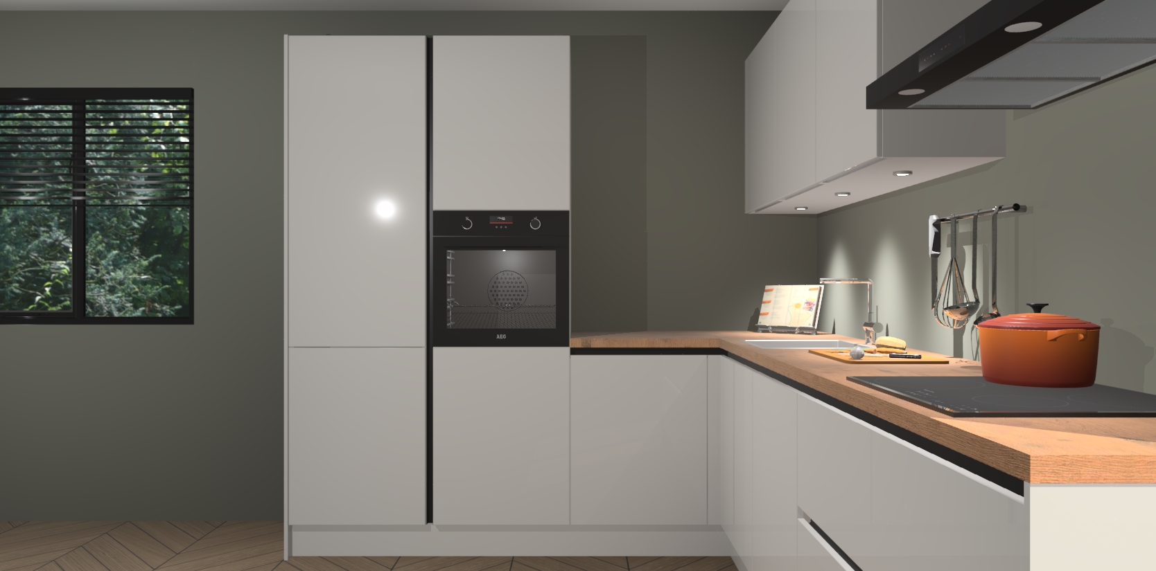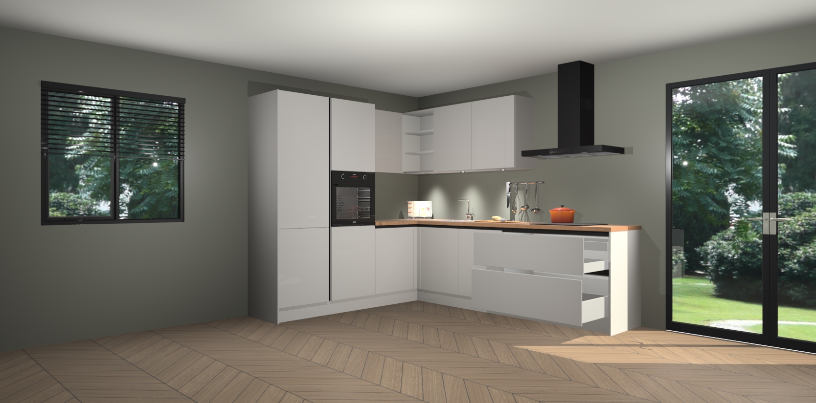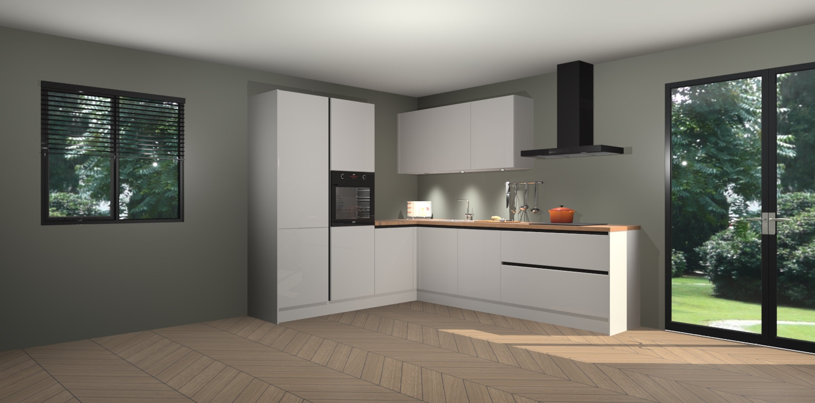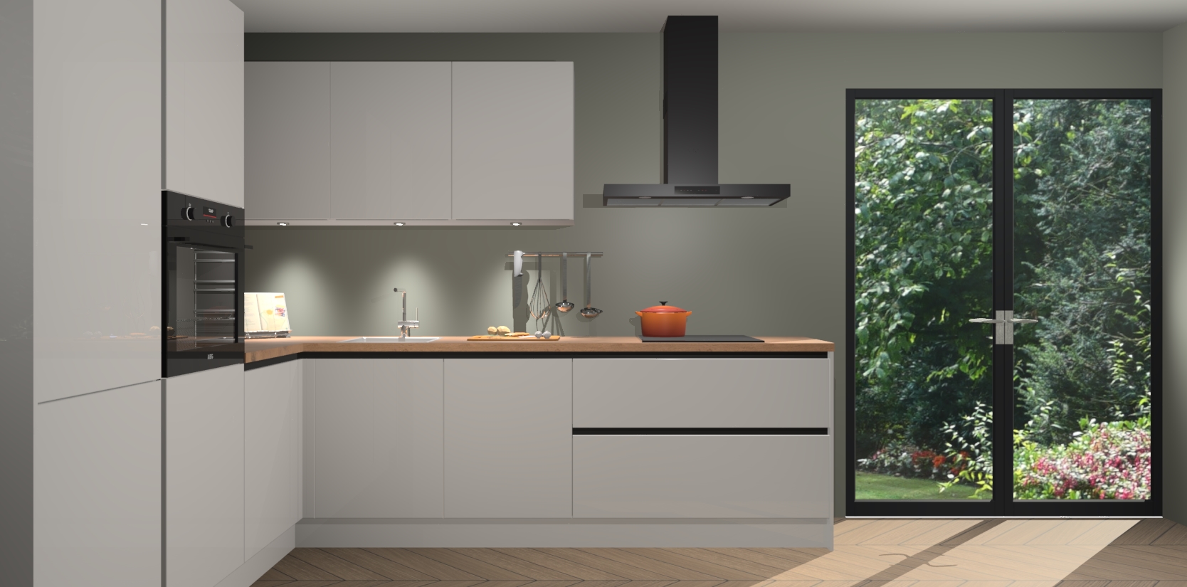 Maak kennis met de zijdegrijze hoogglans greeploze keuken Parla - de perfecte aanvulling voor uw moderne keuken! Ervaar tijdloos design, elegantie en een chique uitstraling met onze zwarte handgrepen, soft-close deuren en veel opbergruimte. Dit alles wordt aangeboden tegen een vaste lage prijs voor ongeëvenaarde Duitse keukenkwaliteit!