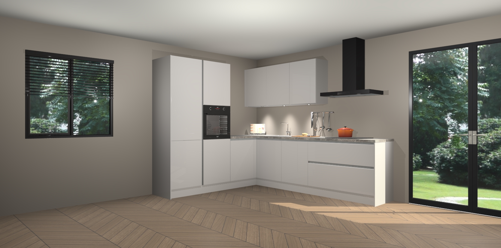 Maak kennis met de zijdegrijze hoogglans greeploze keuken Parla - de perfecte aanvulling voor uw moderne keuken! Ervaar tijdloos design, elegantie en een chique uitstraling met onze zwarte handgrepen, soft-close deuren en veel opbergruimte. Dit alles wordt aangeboden tegen een vaste lage prijs voor ongeëvenaarde Duitse keukenkwaliteit!