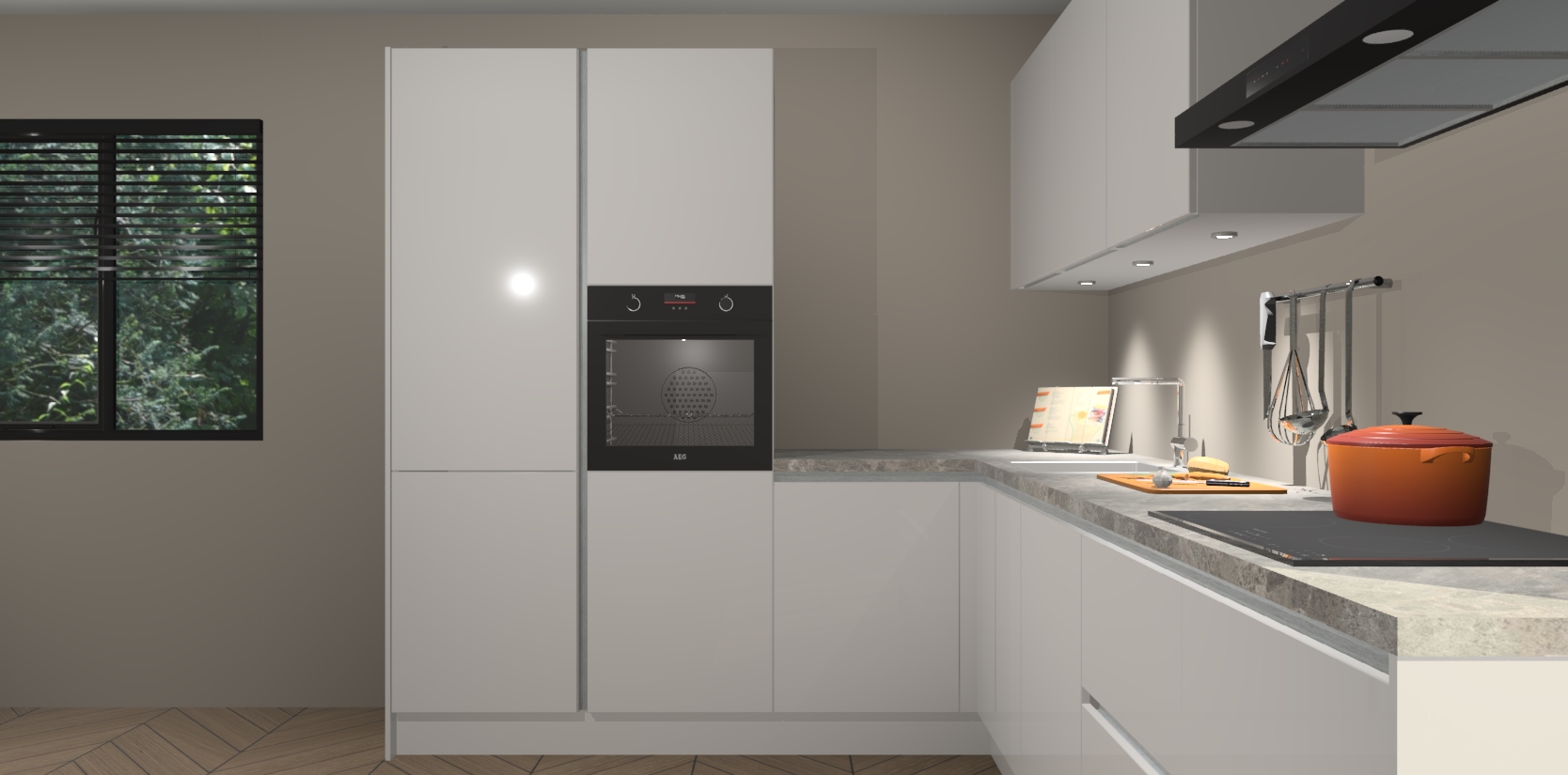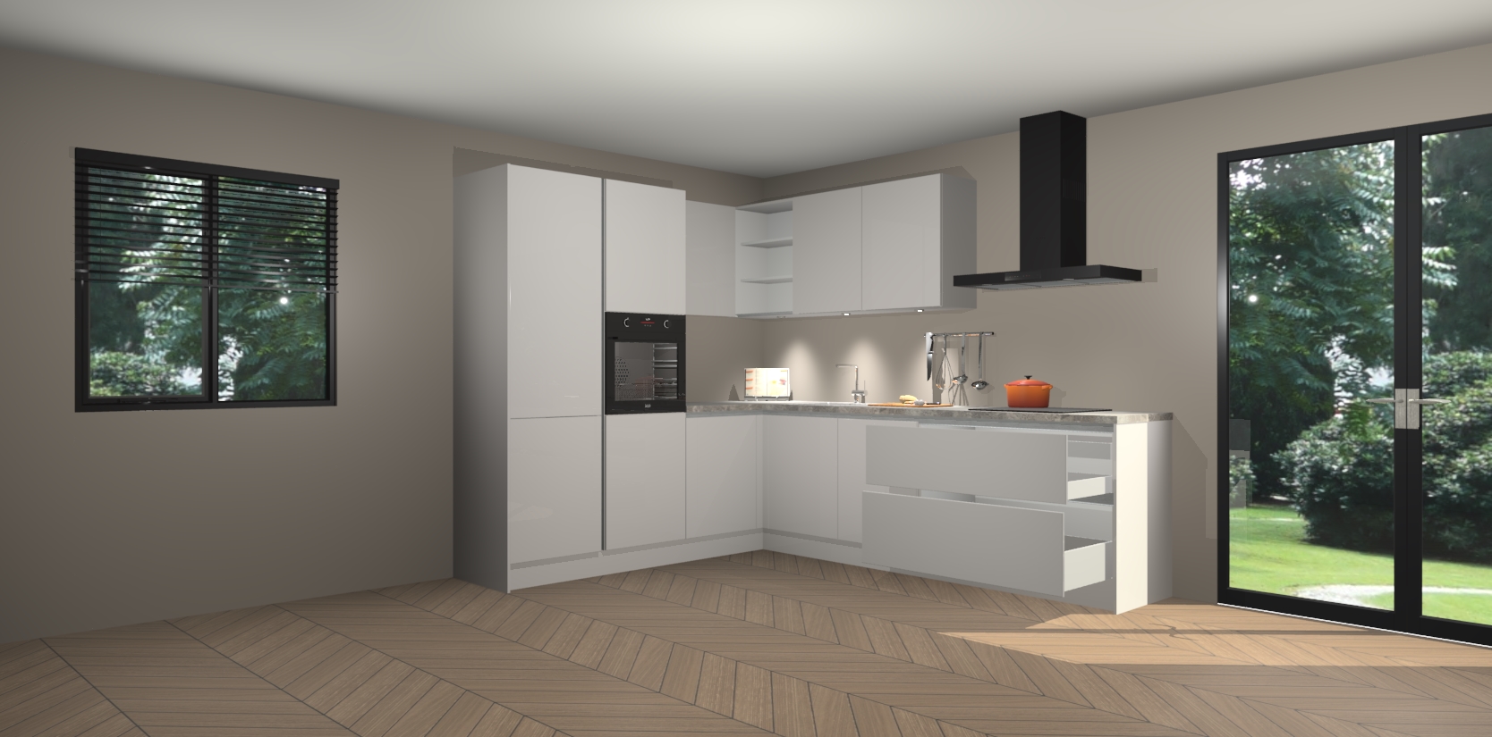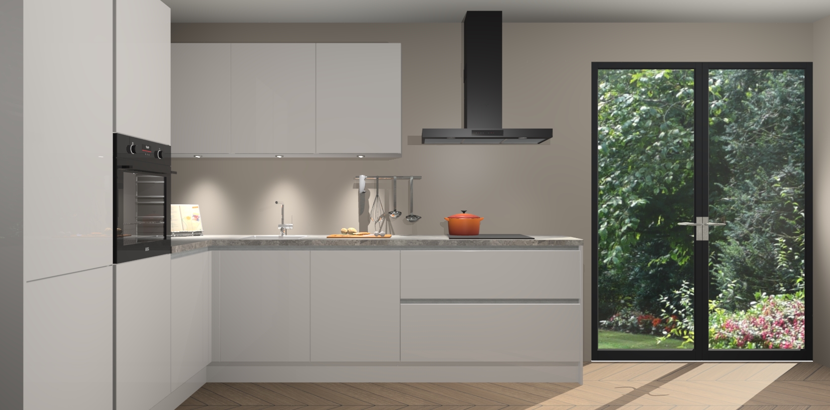 Met de zijdegrijze hoogglans greeploze keuken Parla Maakt u van uw keuken het pronkstuk van uw huis. Stijlvol en toch praktisch, de nieuwste look voor wie meer waarde en charme aan zijn huis wil toevoegen. Met prachtige zwarte handgrepen die zich lenen voor een klassieke stijlbron, zal u niet teleurgesteld zijn in het resultaat. De soft-close deurscharnieren geven een gevoel van luxe omdat ze zachtjes bewegen zonder storende of krakende geluiden te veroorzaken.