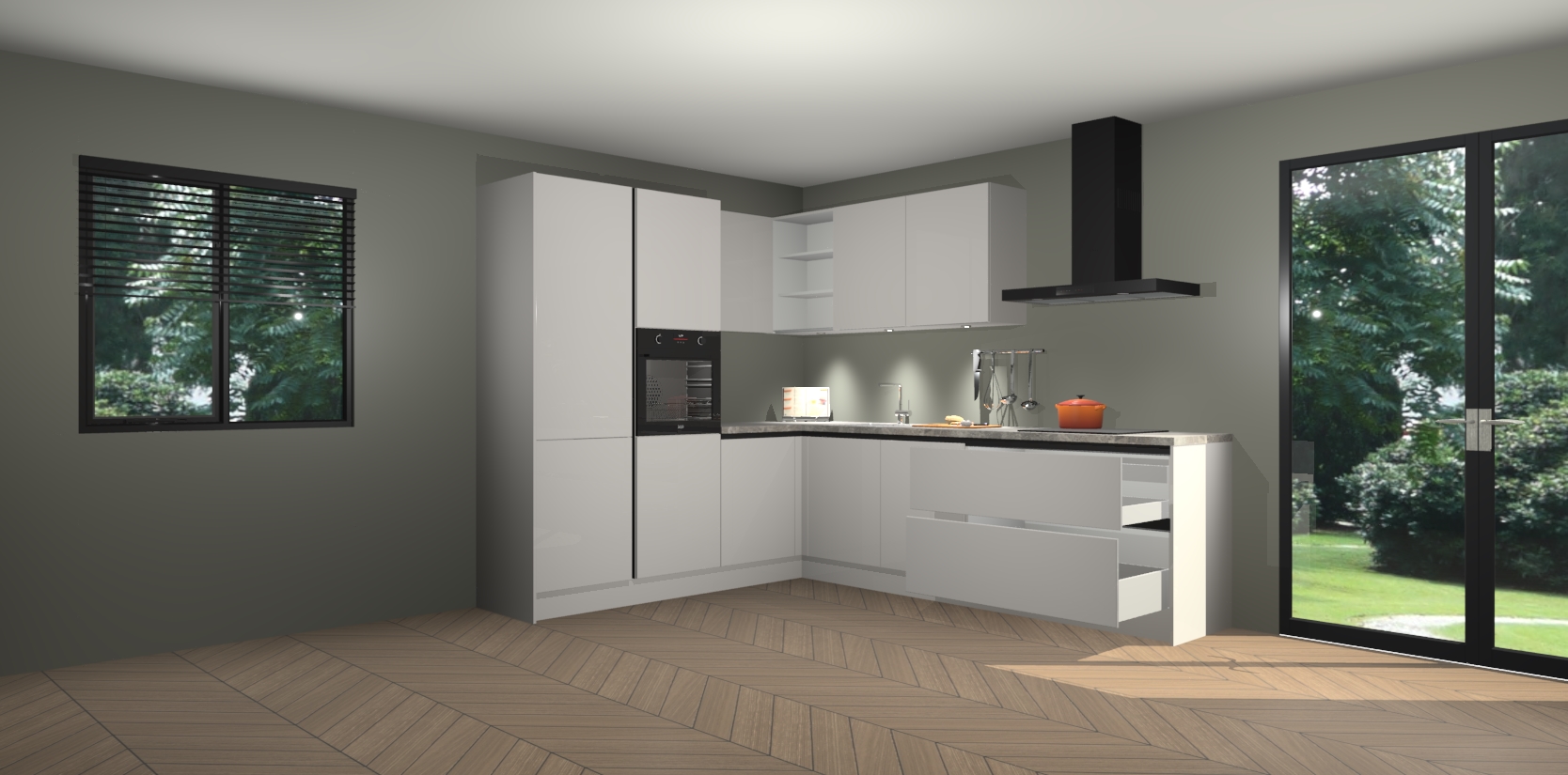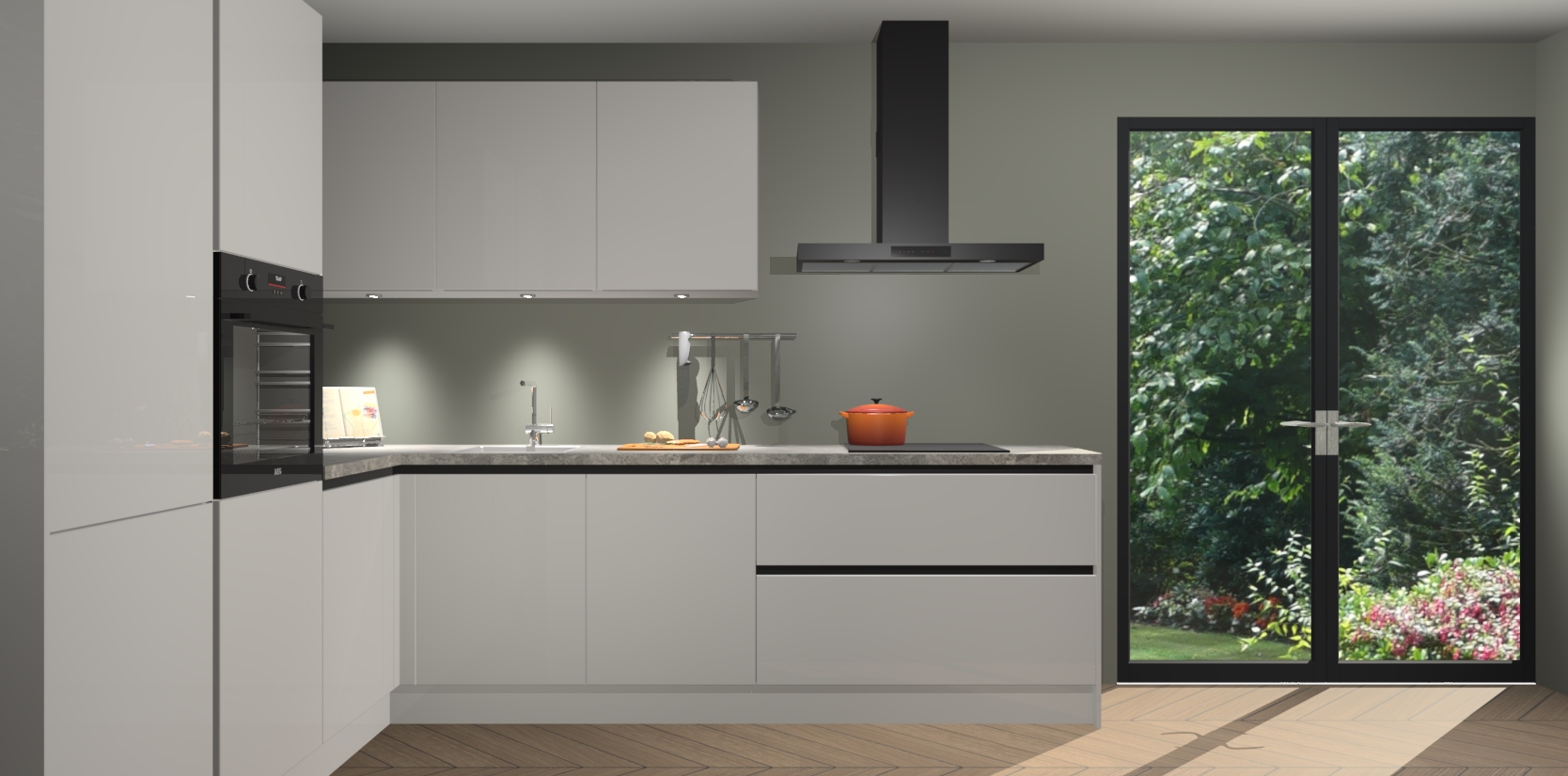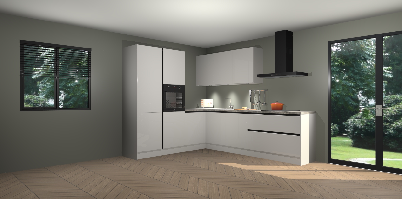 Met de zijdegrijze hoogglans greeploze keuken Parla Maakt u van uw keuken het pronkstuk van uw huis. Stijlvol en toch praktisch, de nieuwste look voor wie meer waarde en charme aan zijn huis wil toevoegen. Met prachtige zwarte handgrepen die zich lenen voor een klassieke stijlbron, zal u niet teleurgesteld zijn in het resultaat. De soft-close deurscharnieren geven een gevoel van luxe omdat ze zachtjes bewegen zonder storende of krakende geluiden te veroorzaken.