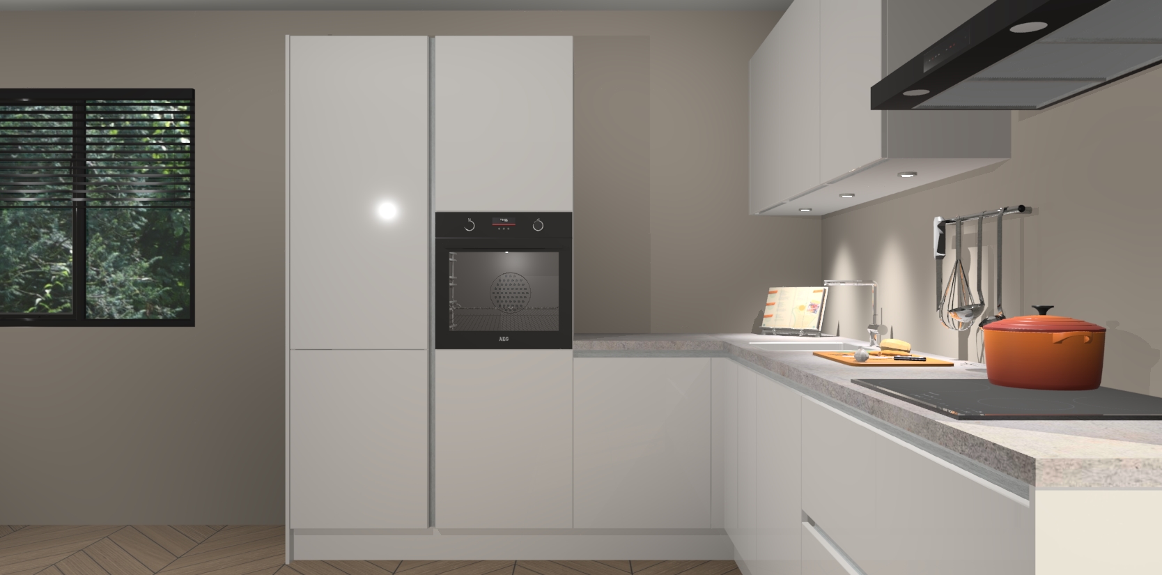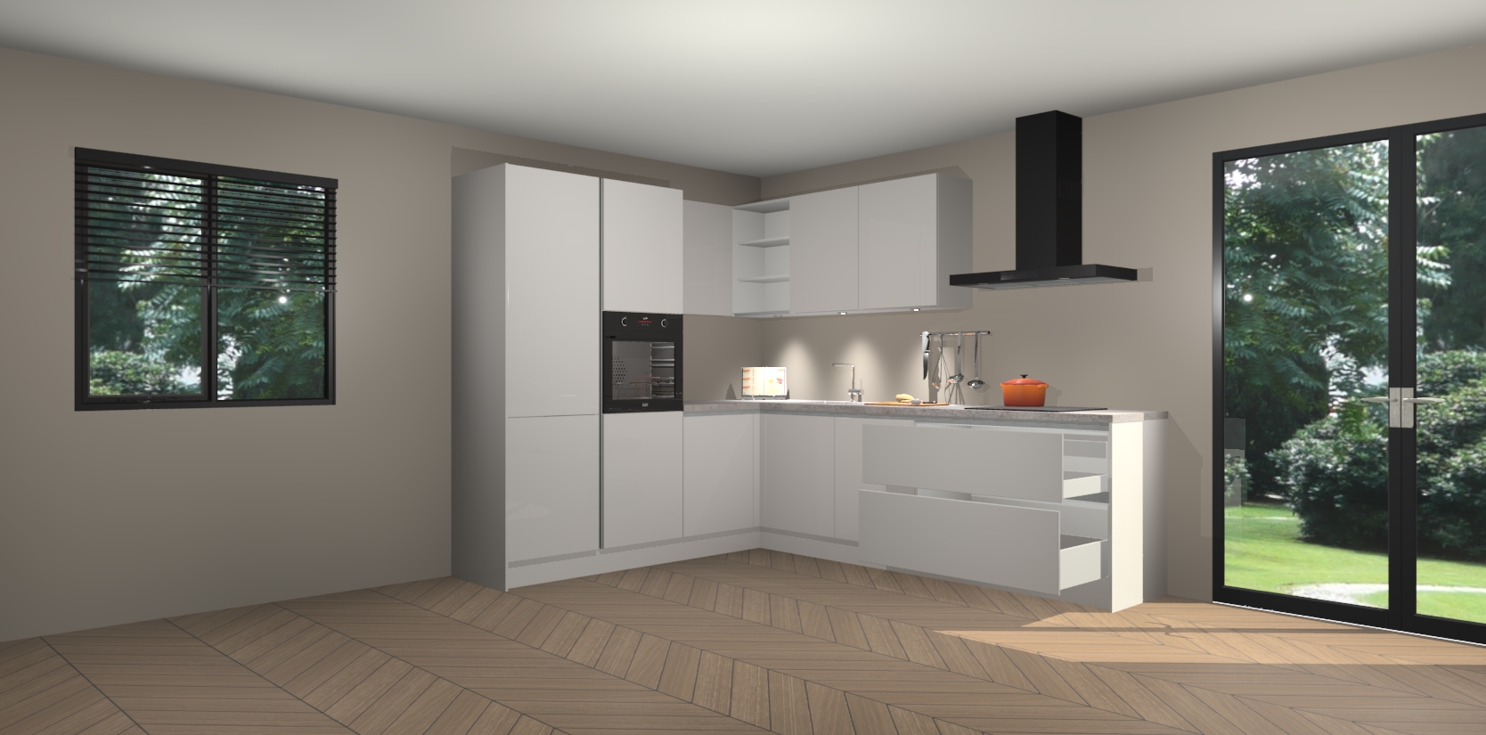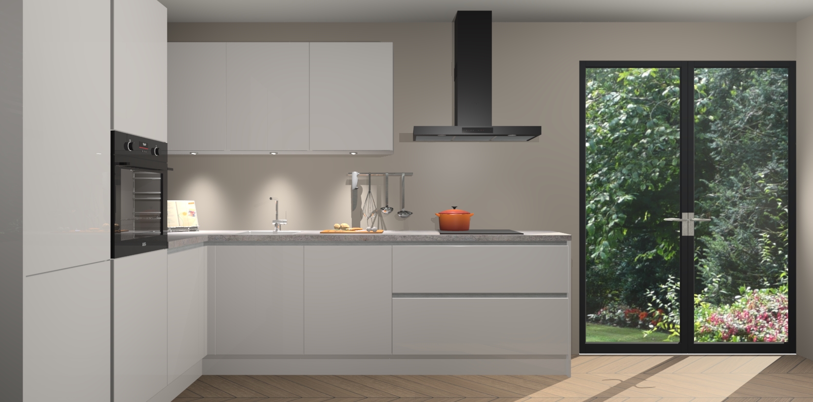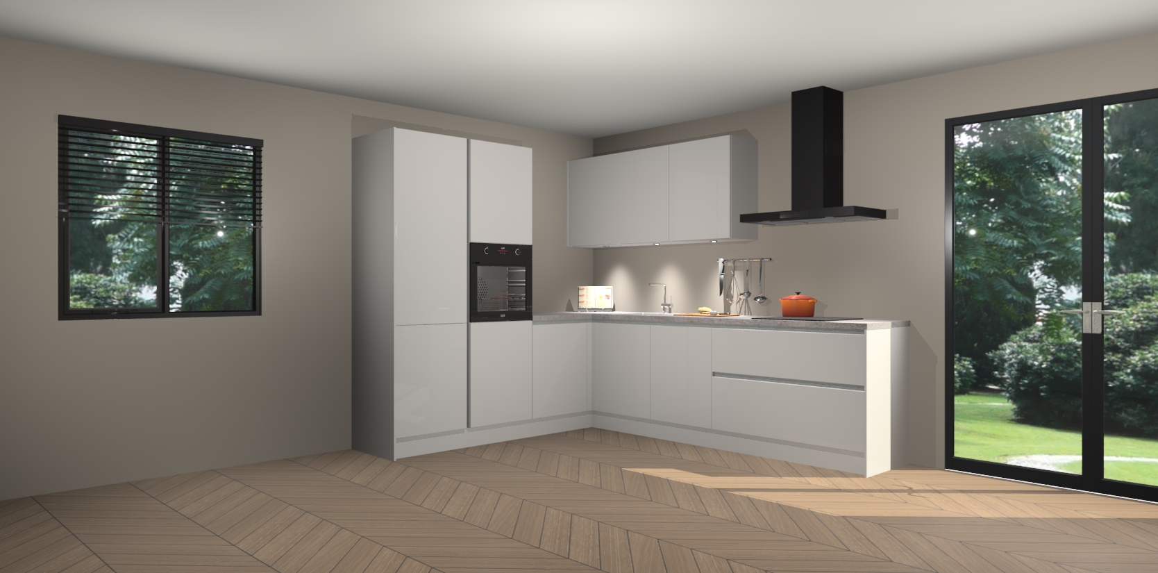 Maak kennis met de zijdegrijze hoogglans greeploze keuken Parla - de perfecte aanvulling voor uw moderne keuken! Ervaar tijdloos design, elegantie en een chique uitstraling met onze zwarte handgrepen, soft-close deuren en veel opbergruimte. Dit alles wordt aangeboden tegen een vaste lage prijs voor ongeëvenaarde Duitse keukenkwaliteit!