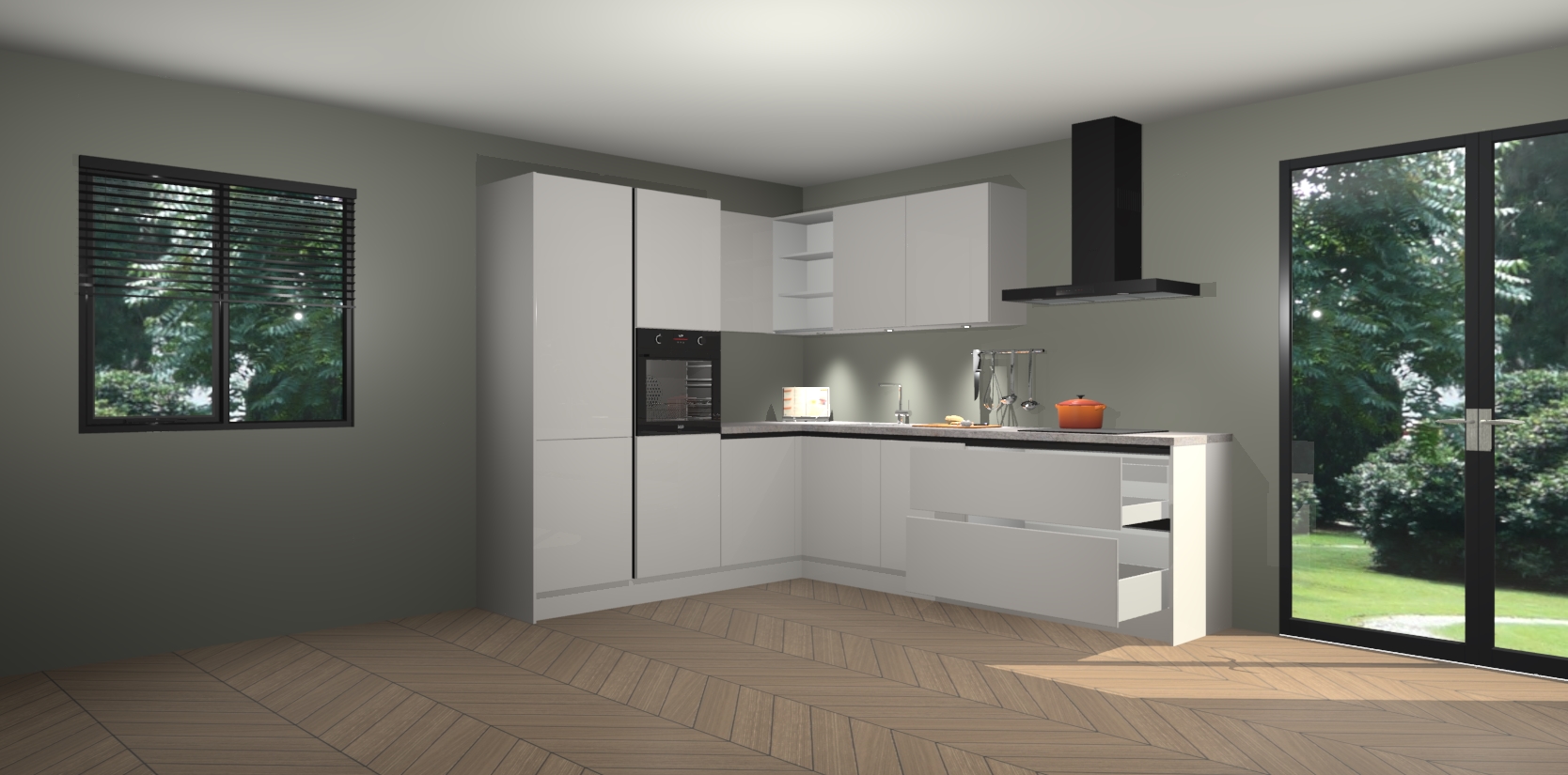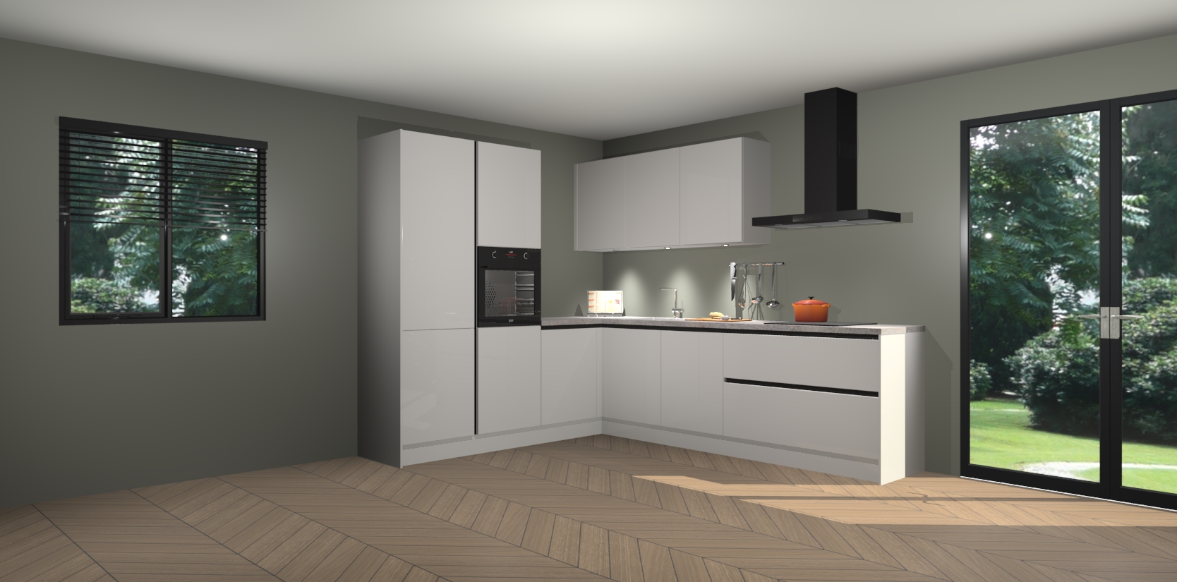 Met de zijdegrijze hoogglans greeploze keuken Parla Maakt u van uw keuken het pronkstuk van uw huis. Stijlvol en toch praktisch, de nieuwste look voor wie meer waarde en charme aan zijn huis wil toevoegen. Met prachtige zwarte handgrepen die zich lenen voor een klassieke stijlbron, zal u niet teleurgesteld zijn in het resultaat. De soft-close deurscharnieren geven een gevoel van luxe omdat ze zachtjes bewegen zonder storende of krakende geluiden te veroorzaken.