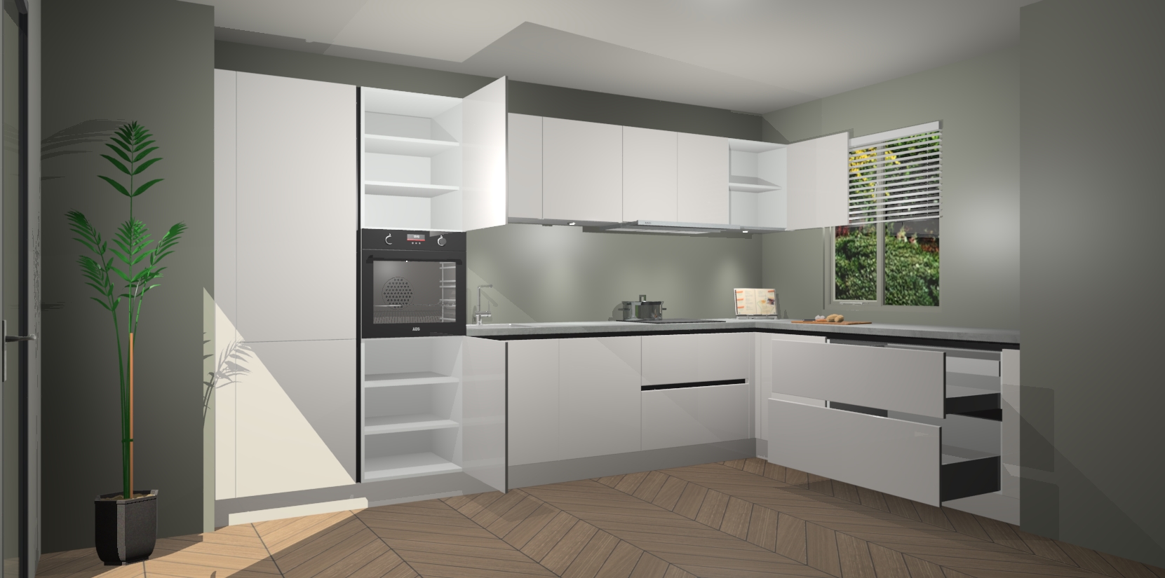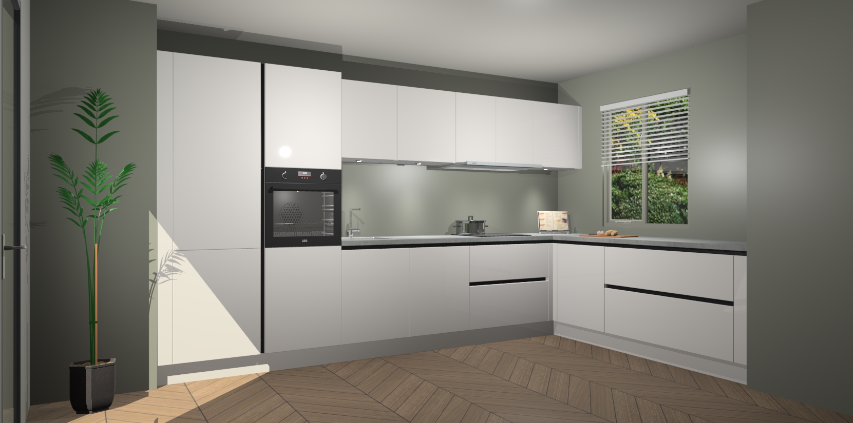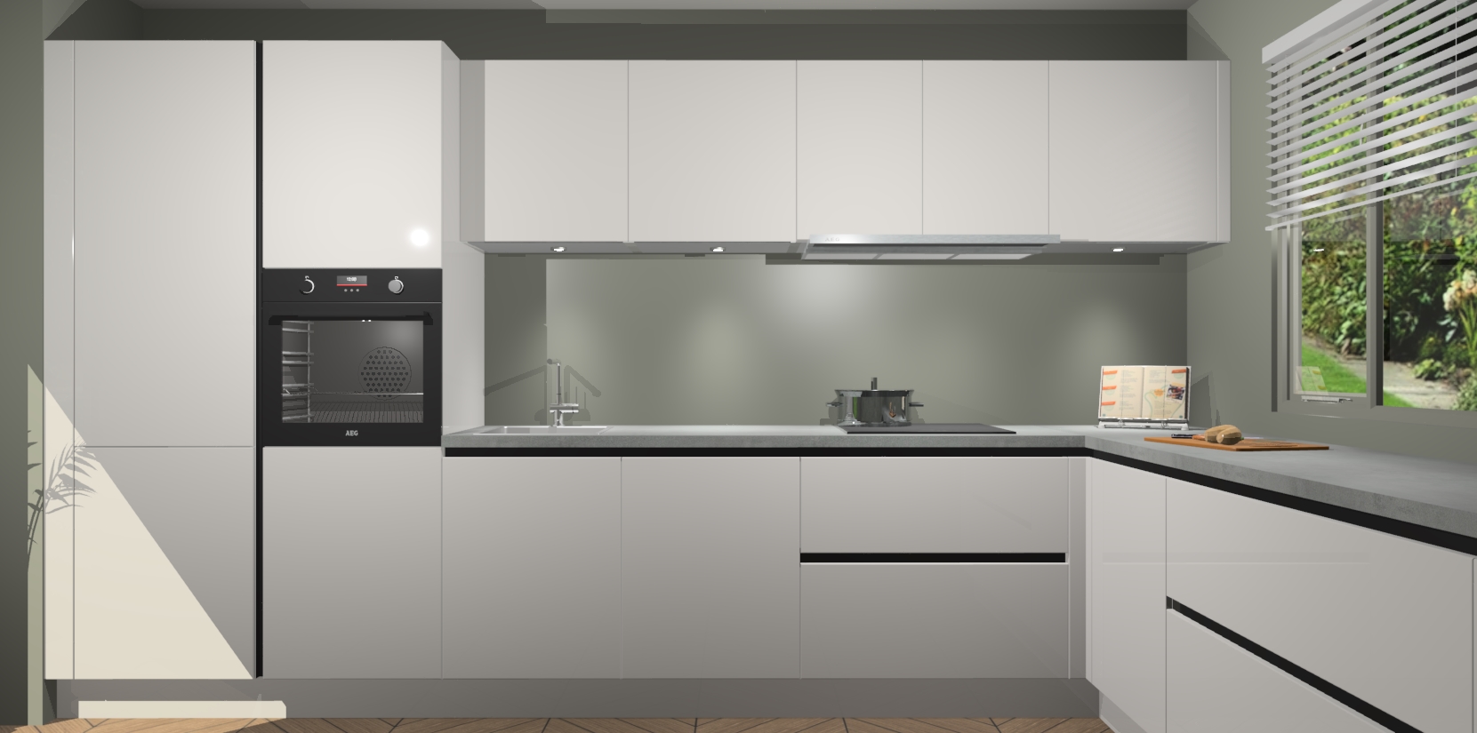 Verwelkom de natuurlijke warmte van de Zijdegrijze Hoogglans greeploze keuken Petten in uw huis. Deze prachtige hoekkeuken met zijn moderne design en warme houten look geeft u meer dan genoeg opbergruimte om uw comfortabel te voelen in uw keuken. Geniet van soft-close deuren die al uw gasten het gevoel zullen geven dat ze zich in een luxueuze ruimte bevinden.