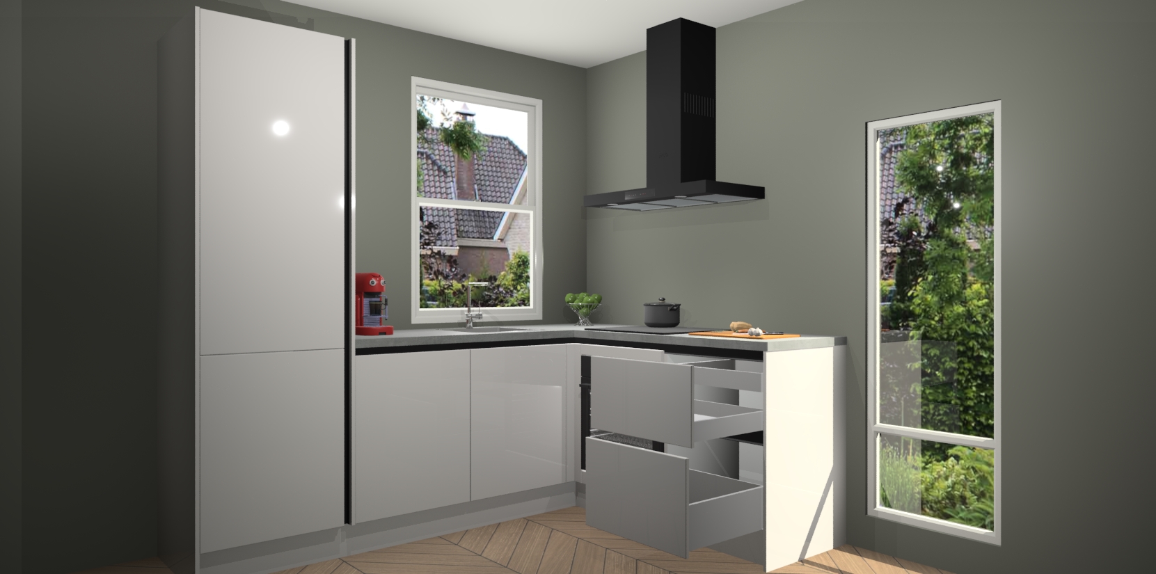 De prachtige Zijdegrijze hoogglans greeploze keuken Phuket is de perfecte keuze als u op zoek bent naar een moderne hoekkeuken met alle luxe en comfort die u kunt verwachten! De uitstraling in het houtlook-design draagt bij aan de warme sfeer die u nu al voelt wanneer u er naar kijkt. Heeft u genoeg van ouderwetse keukens? Probeer dan direct deze moderne, mooie hoekkeukens en laat iedereen verbluft achter!