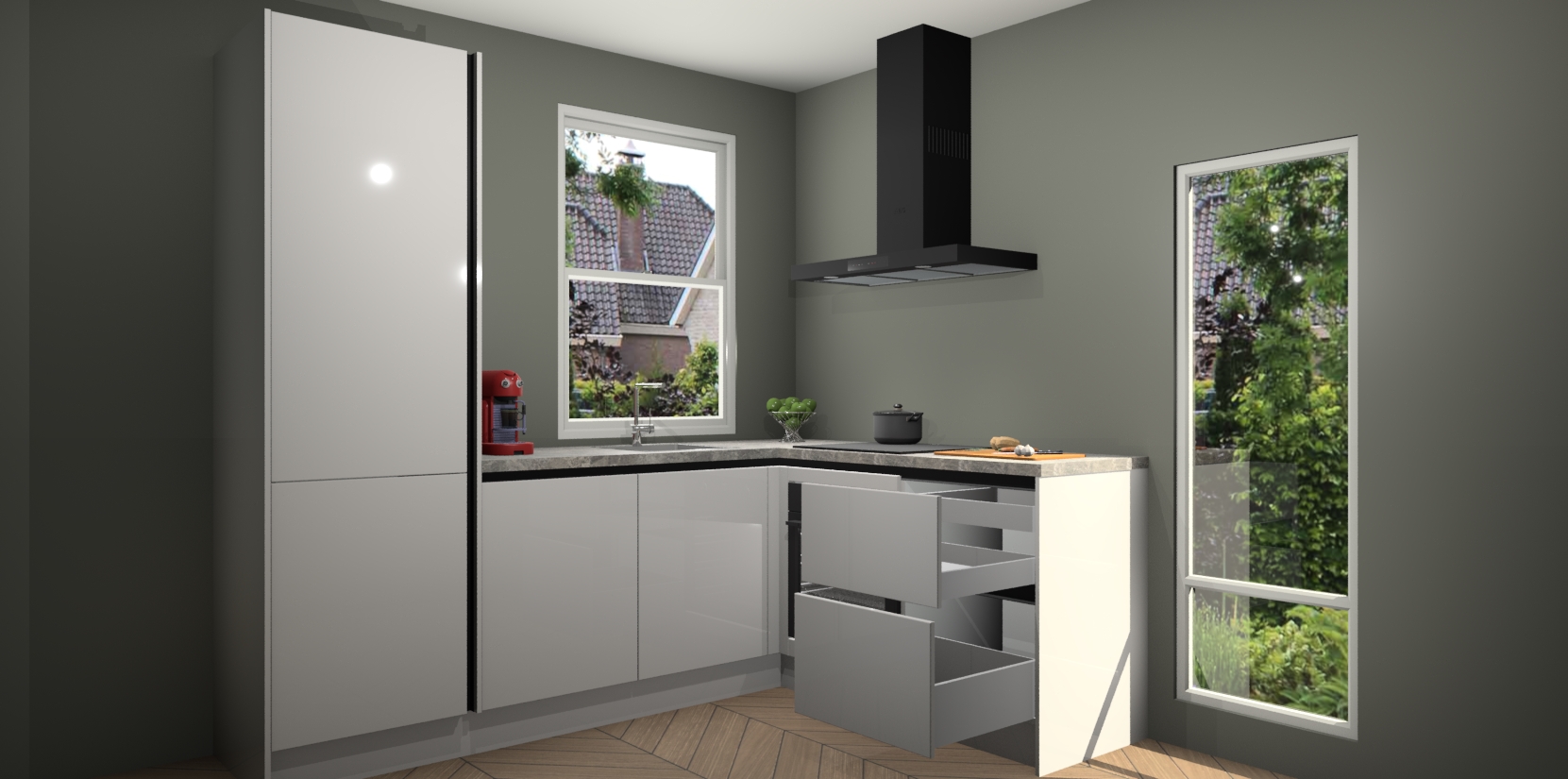 De prachtige Zijdegrijze hoogglans greeploze keuken Phuket is de perfecte keuze als u op zoek bent naar een moderne hoekkeuken met alle luxe en comfort die u kunt verwachten! De uitstraling in het houtlook-design draagt bij aan de warme sfeer die u nu al voelt wanneer u er naar kijkt. Heeft u genoeg van ouderwetse keukens? Probeer dan direct deze moderne, mooie hoekkeukens en laat iedereen verbluft achter!