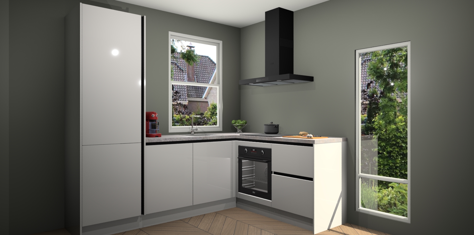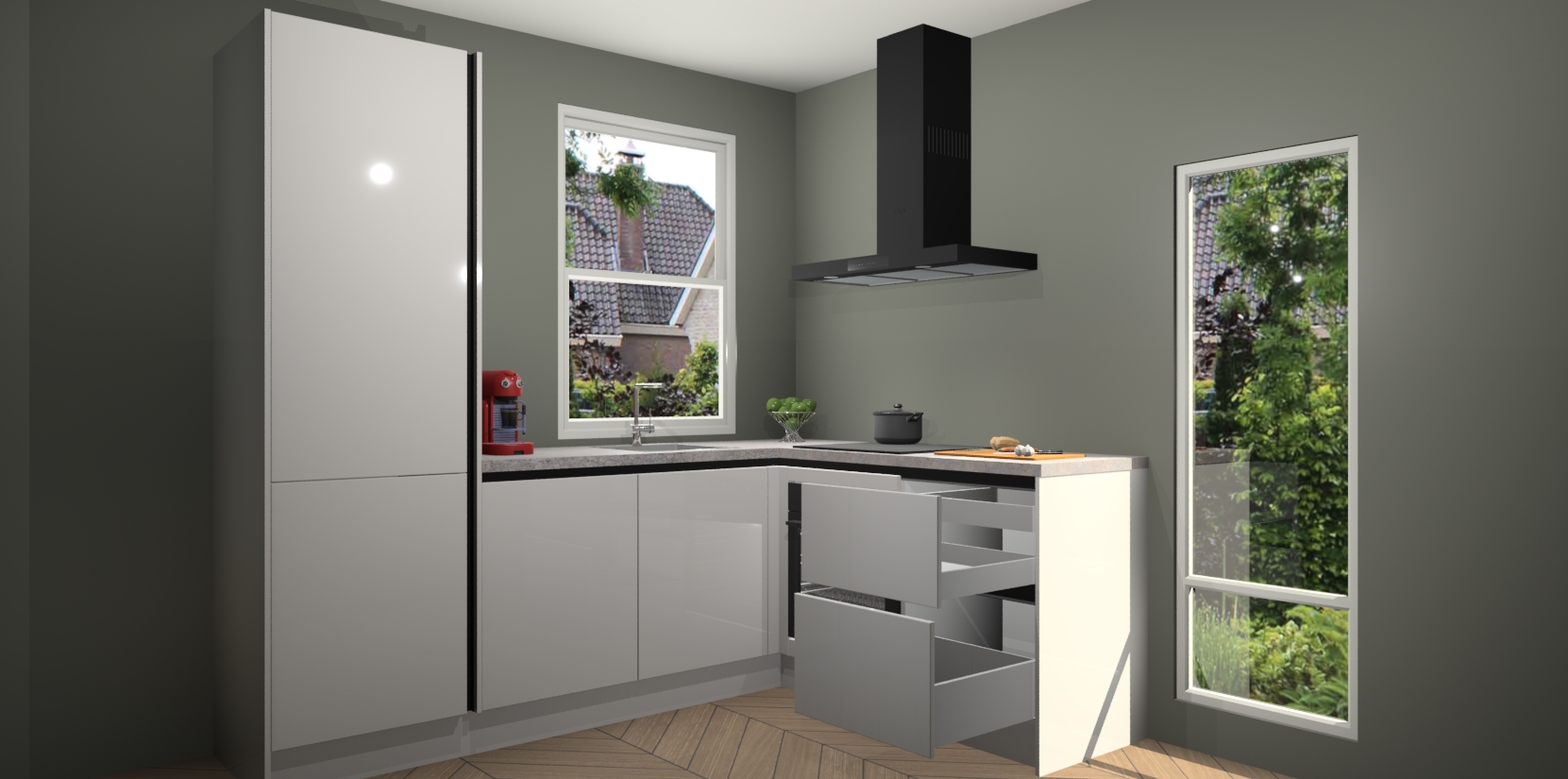 De Zijdegrijze hoogglans greeploze keuken Phuket heeft alles wat u maar kunt wensen. Niet alleen zijn er softclose deuren, maar ook 5 ingebouwde apparaten: een oven, inductiekookplaat, afzuigkap, vaatwasser en koelkast - waarbij u later gemakkelijk naar het AEG merk, van inductiekookplaat naar kookplaat met geïntegreerde afzuiging of van oven naar combimagnetron kunt upgraden. Dat alles tegen een vast laag tarief! Bovendien geeft de Zijdegrijze hoogglans greeploze keuken Phuket supersnelle levering van 7 weken. Echt iets voor u als u er niet op wilt wachten om het resultaat te zien in eigen keuken!
