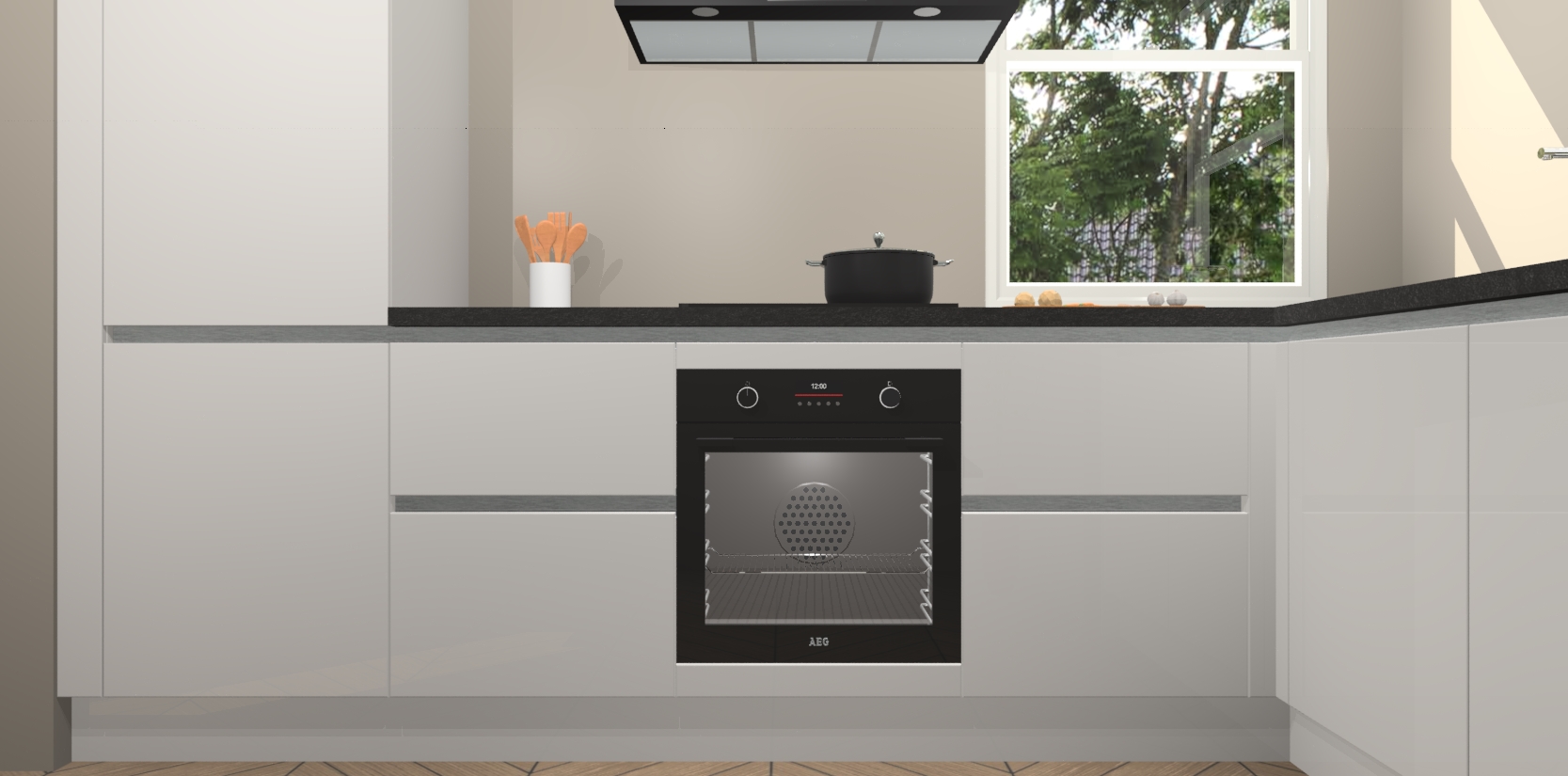 Wat maakt deze keuken zo bijzonder? Ten eerste geeft het houten werkblad uw ruimte een onmiskenbaar klassieke uitstraling. De natuurlijke afwerking roept warmte en elegantie op die nooit uit de mode zullen raken. Bovendien is het gemakkelijk schoon te houden en te onderhouden, zodat je er jarenlang plezier van kunt hebben. Als u op zoek bent naar extra gemak in uw keuken, dan heeft u bij het plaatsen van een bestelling bij ons ook de optie om uw toestellen te upgraden naar AEG-modellen - zo haalt u moderne innovatie van topmerken in apparatentechnologie rechtstreeks in huis.