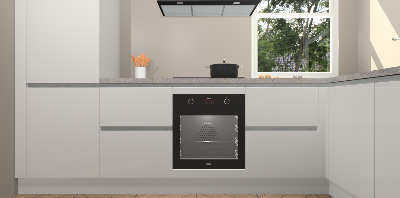 Wat maakt deze keuken zo bijzonder? Ten eerste geeft het houten werkblad uw ruimte een onmiskenbaar klassieke uitstraling. De natuurlijke afwerking roept warmte en elegantie op die nooit uit de mode zullen raken. Bovendien is het gemakkelijk schoon te houden en te onderhouden, zodat je er jarenlang plezier van kunt hebben. Als u op zoek bent naar extra gemak in uw keuken, dan heeft u bij het plaatsen van een bestelling bij ons ook de optie om uw toestellen te upgraden naar AEG-modellen - zo haalt u moderne innovatie van topmerken in apparatentechnologie rechtstreeks in huis.