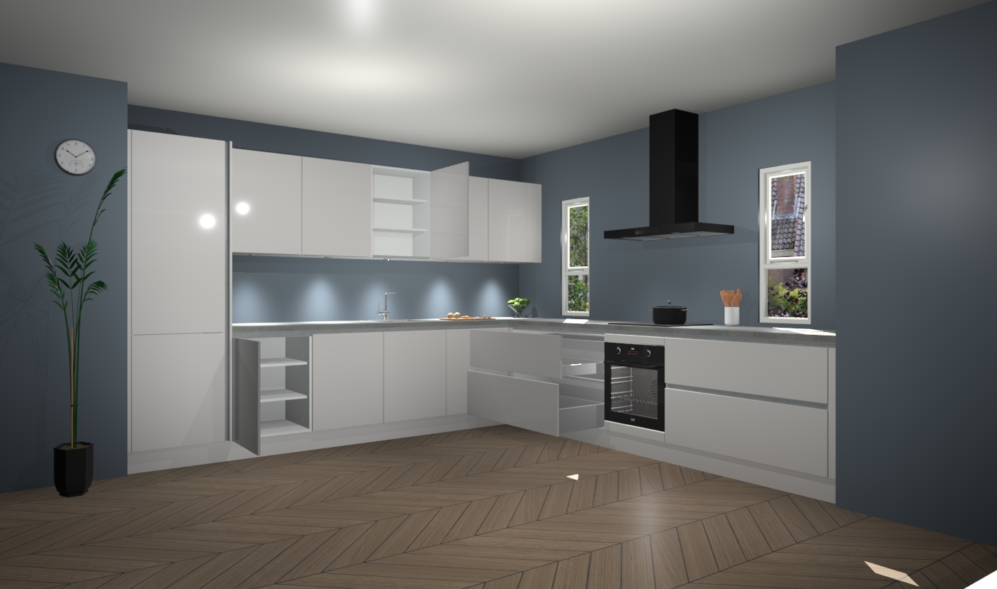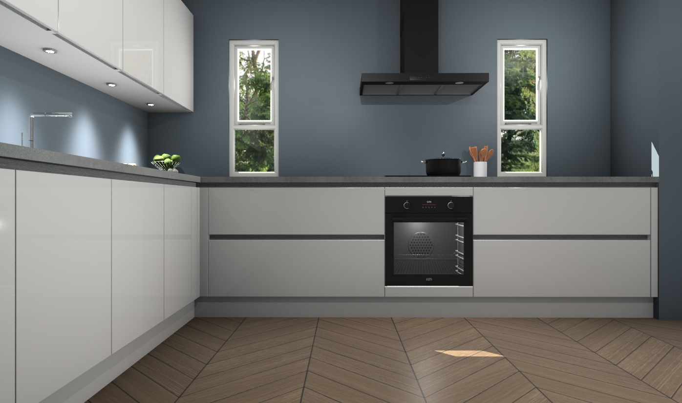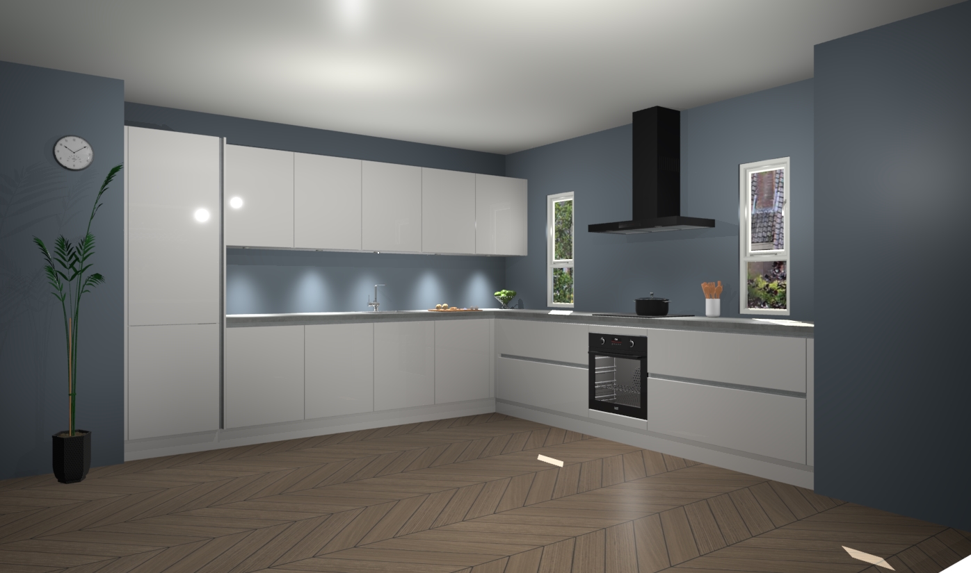 De zijdegrijze hoogglans greeploze keuken is een ideale hoekkeuken en heeft alle functies en apparatuur die u maar nodig kunt hebben. Bij de bestelling krijgt u een oven, inductiekookplaat, afzuigkap, vaatwasser en koelkast - deze kunnen desgewenst eenvoudig worden uitgebreid naar AEG na bestellen. Elke kast wordt ook voor gemonteerd geleverd met soft close deuren die jarenlang gebruik beloven. Stelt u zich voor dat u geen gedoe heeft met vervelende montage - vanaf het moment dat u uw bestelling plaats, duurt het slechts 7 weken voor het bij u thuis geleverd wordt.