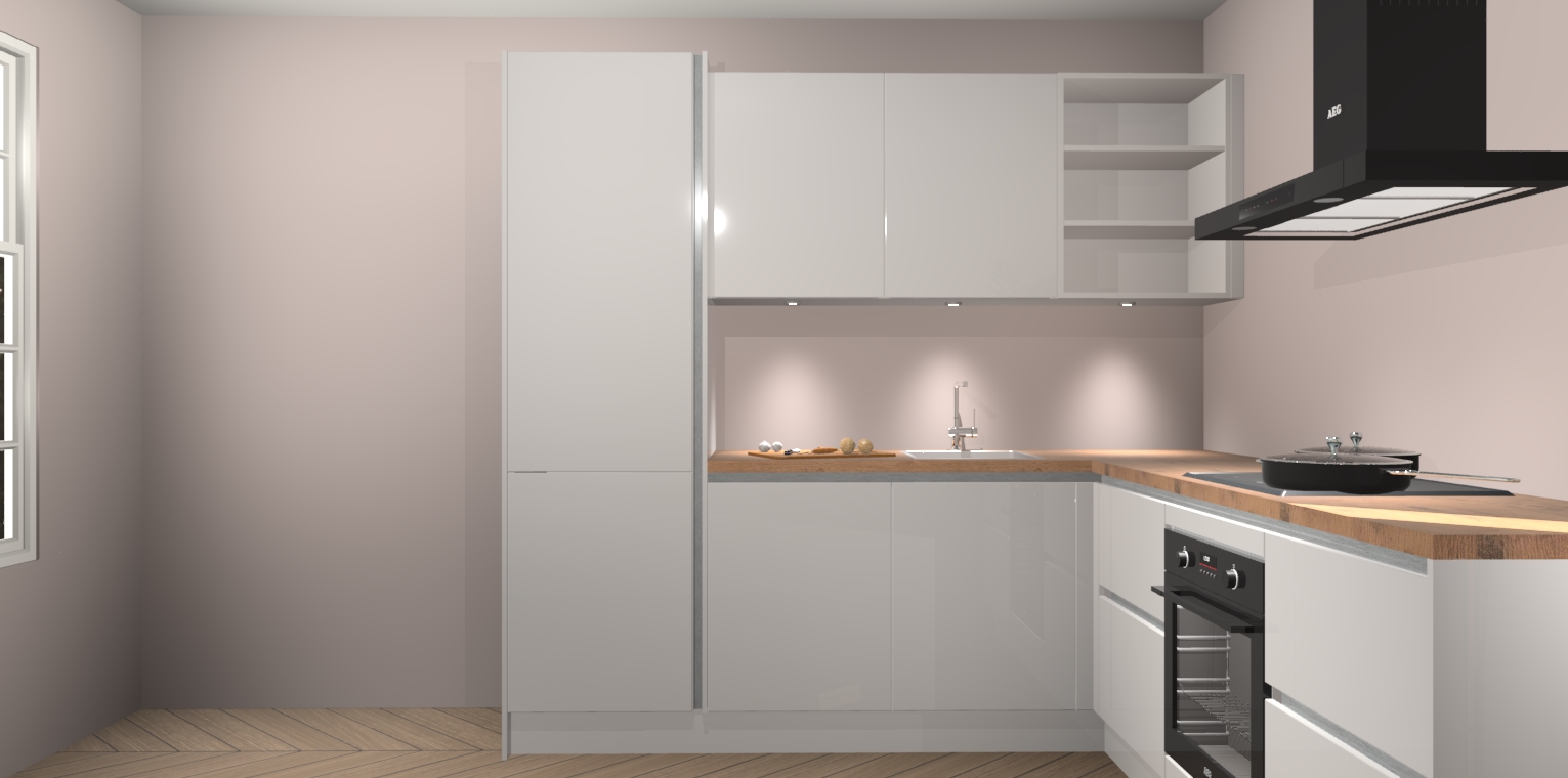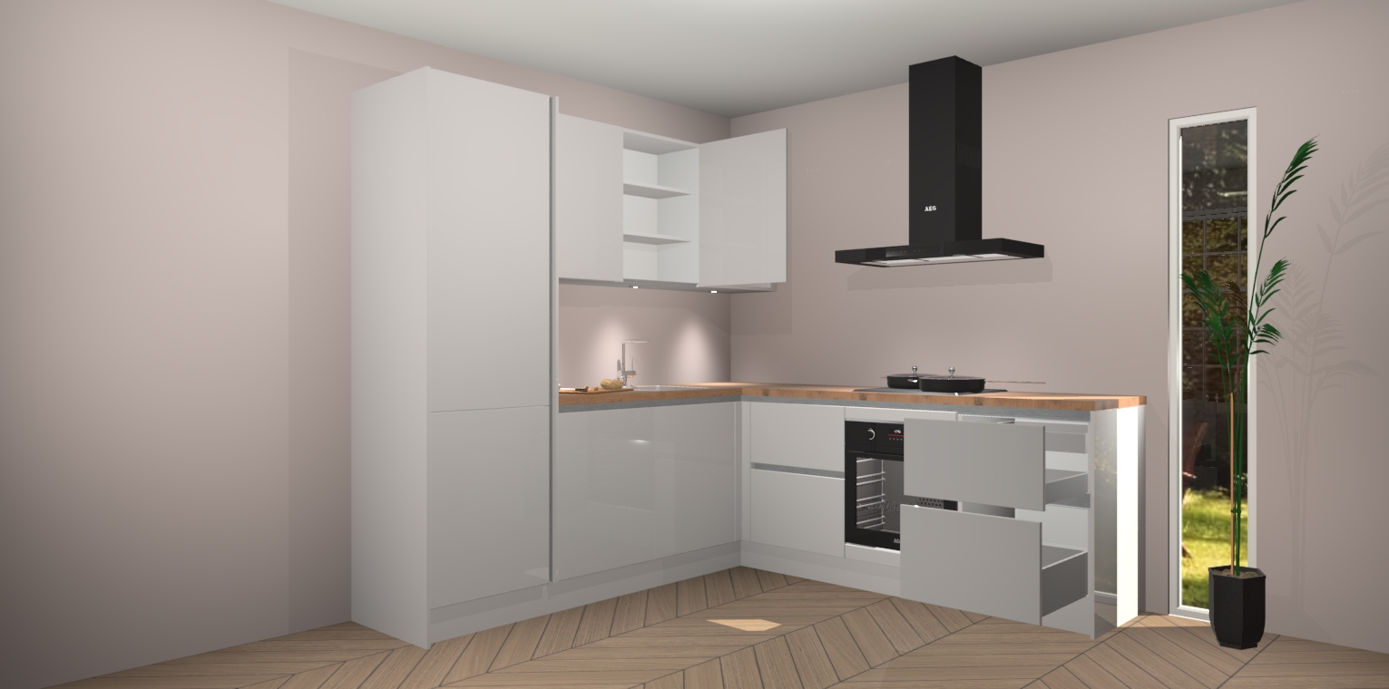 Met zijn moderne design en aantrekkelijke hoekopstelling biedt deze keuken een unieke look die zelfs de meest veeleisende huiseigenaar zal bevallen. En omdat de binnenkant van de kasten dezelfde kleur heeft als de buitenkant, heeft uw keuken een consistente afwerking. Bovenop de geweldige look is opbergruimte ook geen probleem, met voldoende kast- en laderuimte achter zelfs de mooiste buitenkant.
