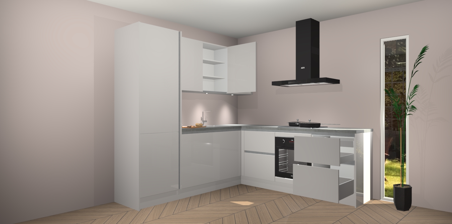Met zijn moderne design en aantrekkelijke hoekopstelling biedt deze keuken een unieke look die zelfs de meest veeleisende huiseigenaar zal bevallen. En omdat de binnenkant van de kasten dezelfde kleur heeft als de buitenkant, heeft uw keuken een consistente afwerking. Bovenop de geweldige look is opbergruimte ook geen probleem, met voldoende kast- en laderuimte achter zelfs de mooiste buitenkant.