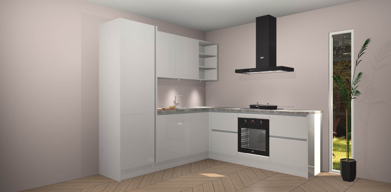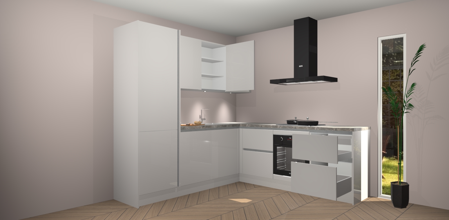 Met zijn moderne design en aantrekkelijke hoekopstelling biedt deze keuken een unieke look die zelfs de meest veeleisende huiseigenaar zal bevallen. En omdat de binnenkant van de kasten dezelfde kleur heeft als de buitenkant, heeft uw keuken een consistente afwerking. Bovenop de geweldige look is opbergruimte ook geen probleem, met voldoende kast- en laderuimte achter zelfs de mooiste buitenkant.