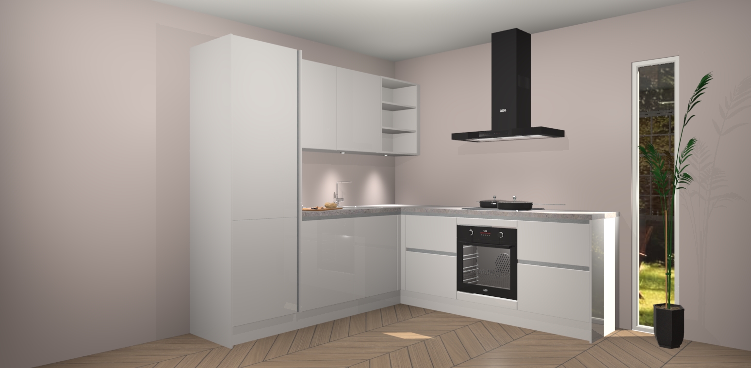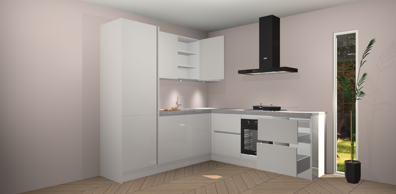 Met zijn moderne design en aantrekkelijke hoekopstelling biedt deze keuken een unieke look die zelfs de meest veeleisende huiseigenaar zal bevallen. En omdat de binnenkant van de kasten dezelfde kleur heeft als de buitenkant, heeft uw keuken een consistente afwerking. Bovenop de geweldige look is opbergruimte ook geen probleem, met voldoende kast- en laderuimte achter zelfs de mooiste buitenkant.