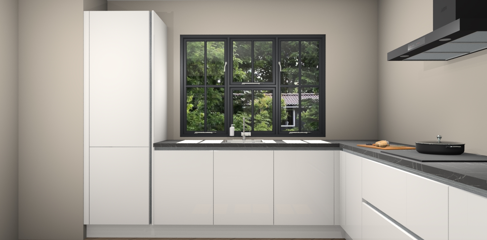 Elke kast heeft softclose deuren die geruisloos openen en sluiten telkens als u ze gebruikt, zodat er geen extra geluid is dat gesprekken of maaltijden in de keuken verstoort.