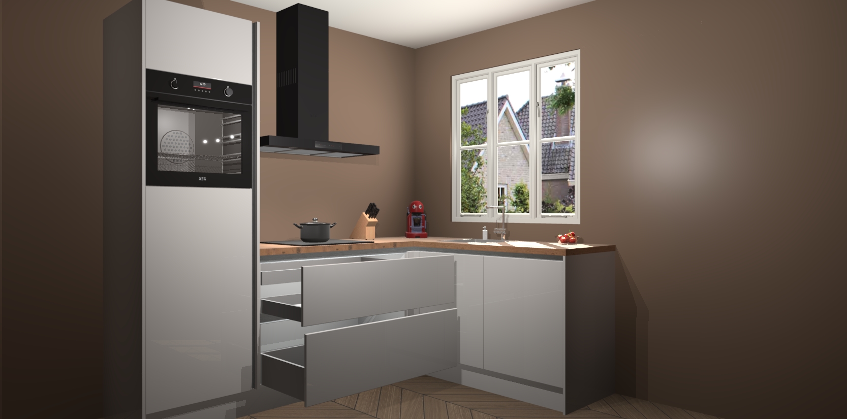 Dit model biedt u voldoende opbergruimte en vijf ingebouwde apparaten: een oven, inductiekookplaat, afzuigkap, vaatwasser en koelkast. Deze apparaten kunnen gemakkelijk worden geüpgrade naar AEG nadat u besteld heeft. De verschillende laden en kastjes bevatten softclose-deuren waardoor ze gezellig dichtvallen met een geruststellend helemaal geruisloos geluid. En dat is nog niet alles! We garanderen ook dat de prijs altijd laag blijft - dus haal nu uw Zijdegrijze hoogglans greeploze keuken Victoria terwijl het kan.