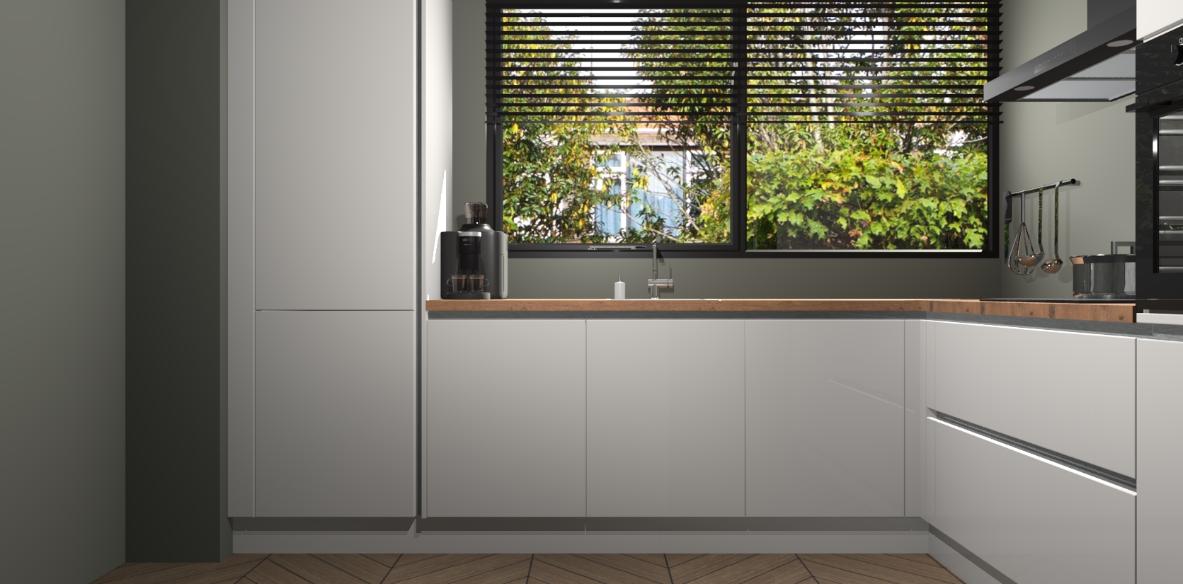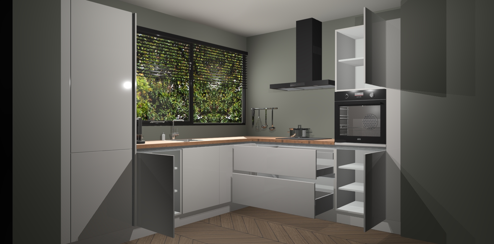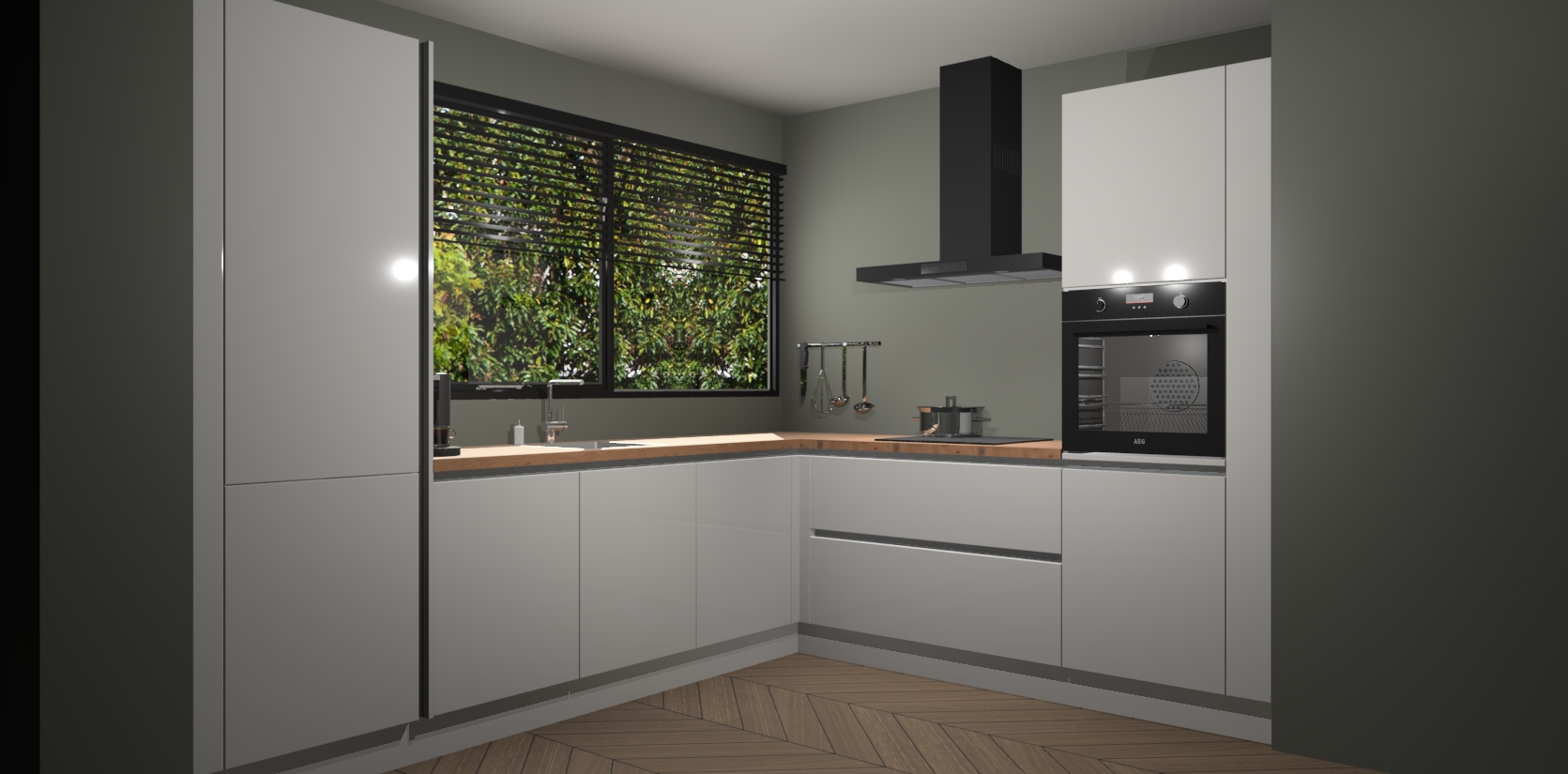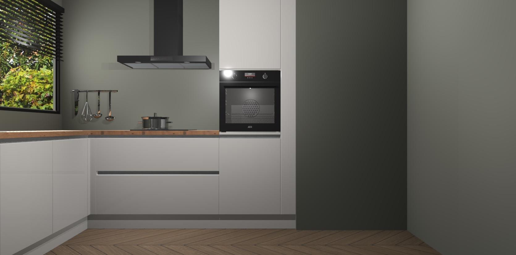 Met een modern, tijdloos design en ruime opslagruimte, zult u zich in no-time thuis voelen in uw nieuwe keuken. Uw leven wordt eenvoudiger met de soft-close deuren die voor het ultieme stille comfort zorgen - geen geluid dat u stoort terwijl u kookt. Ook is de keuken voorzien van 5 ingebouwde apparaten: een oven, inductie kookplaat, afzuigkap, vaatwasser en koelkast. Deze kunnen gemakkelijk na bestelling worden bijgewerkt naar AEG - waardoor uw luxe ervaring compleet is.