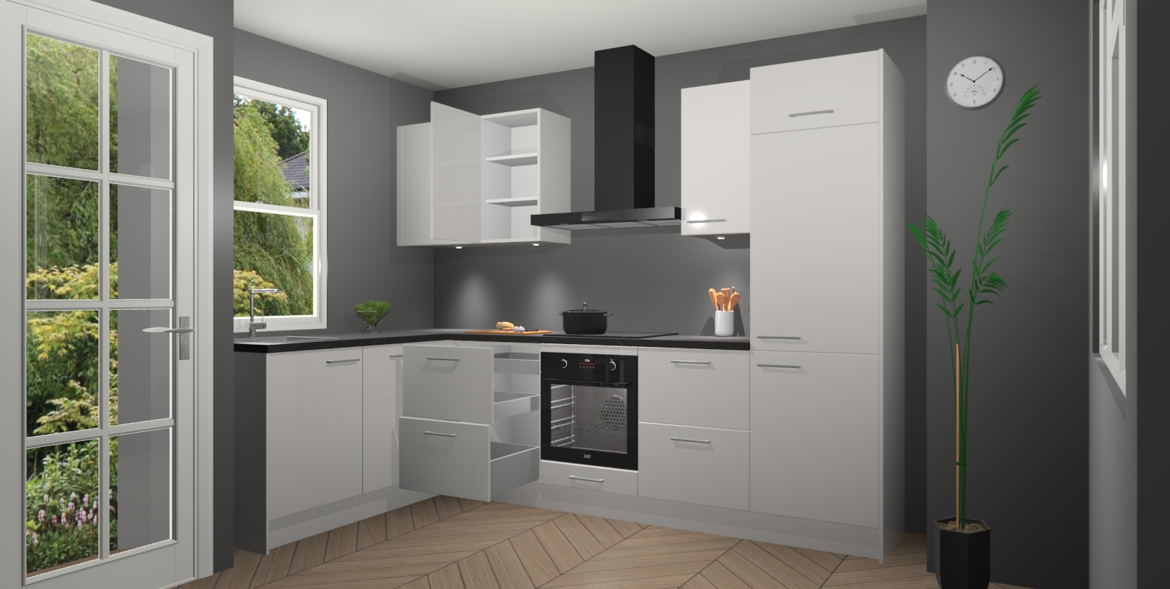 U hoeft zich ook geen zorgen te maken over een gebrek aan opbergruimte, want deze keuken heeft voldoende opbergmogelijkheden zowel boven als onder het aanrecht. Om het leven nog makkelijker te maken, wordt deze moderne hoekkeuken geleverd met 5 ingebouwde apparaten, waaronder een oven, inductiekookplaat, afzuigkap, vaatwasser en koelkast, zodat u in een mum van tijd klaar bent voor actie!
