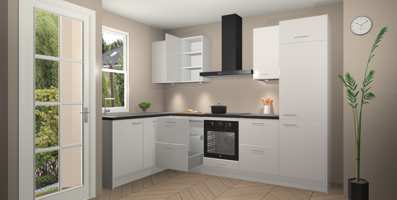 U hoeft zich ook geen zorgen te maken over een gebrek aan opbergruimte, want deze keuken heeft voldoende opbergmogelijkheden zowel boven als onder het aanrecht. Om het leven nog makkelijker te maken, wordt deze moderne hoekkeuken geleverd met 5 ingebouwde apparaten, waaronder een oven, inductiekookplaat, afzuigkap, vaatwasser en koelkast, zodat u in een mum van tijd klaar bent voor actie!