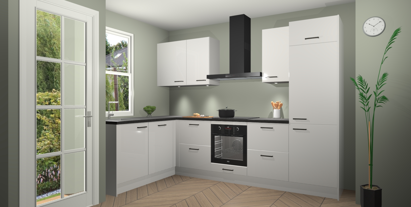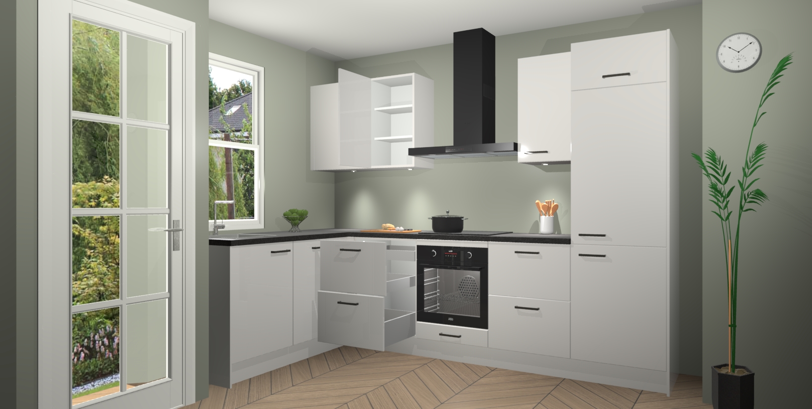 U hoeft zich ook geen zorgen te maken over een gebrek aan opbergruimte, want deze keuken heeft voldoende opbergmogelijkheden zowel boven als onder het aanrecht. Om het leven nog makkelijker te maken, wordt deze moderne hoekkeuken geleverd met 5 ingebouwde apparaten, waaronder een oven, inductiekookplaat, afzuigkap, vaatwasser en koelkast, zodat u in een mum van tijd klaar bent voor actie!