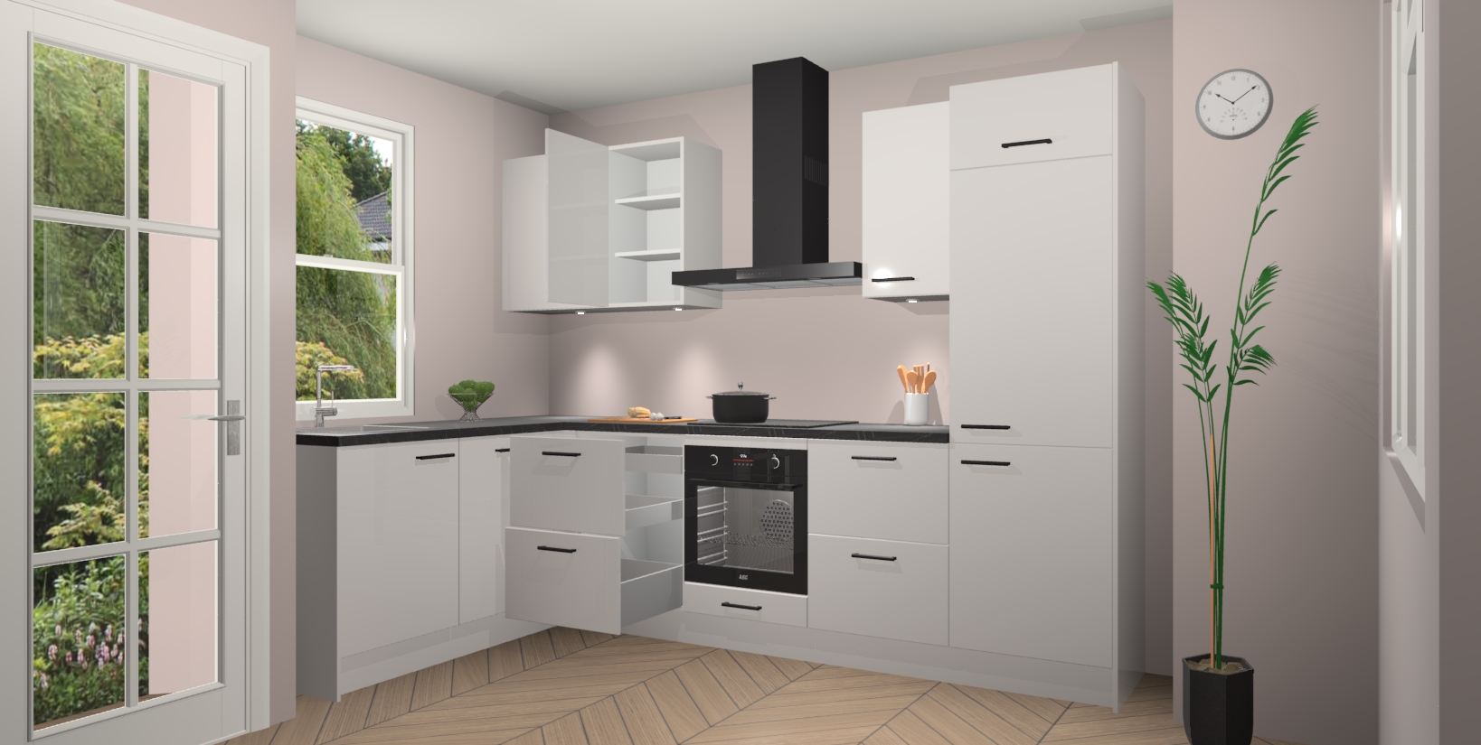 U hoeft zich ook geen zorgen te maken over een gebrek aan opbergruimte, want deze keuken heeft voldoende opbergmogelijkheden zowel boven als onder het aanrecht. Om het leven nog makkelijker te maken, wordt deze moderne hoekkeuken geleverd met 5 ingebouwde apparaten, waaronder een oven, inductiekookplaat, afzuigkap, vaatwasser en koelkast, zodat u in een mum van tijd klaar bent voor actie!