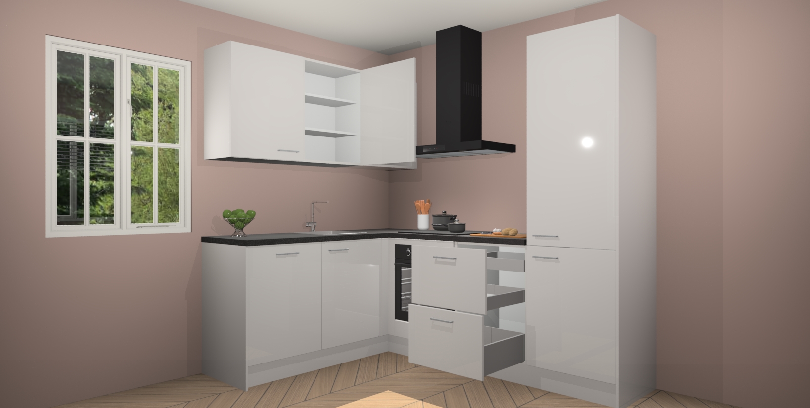 Voor nog meer gemak heeft deze keuken vijf ingebouwde apparaten - oven, inductiekookplaat, afzuigkap, vaatwasser en koelkast. Bovendien hebben alle kasten softclose deuren voor extra comfort bij het sluiten. Dit alles voor een verrassend lage vaste prijs - u vindt nergens anders een betere deal!