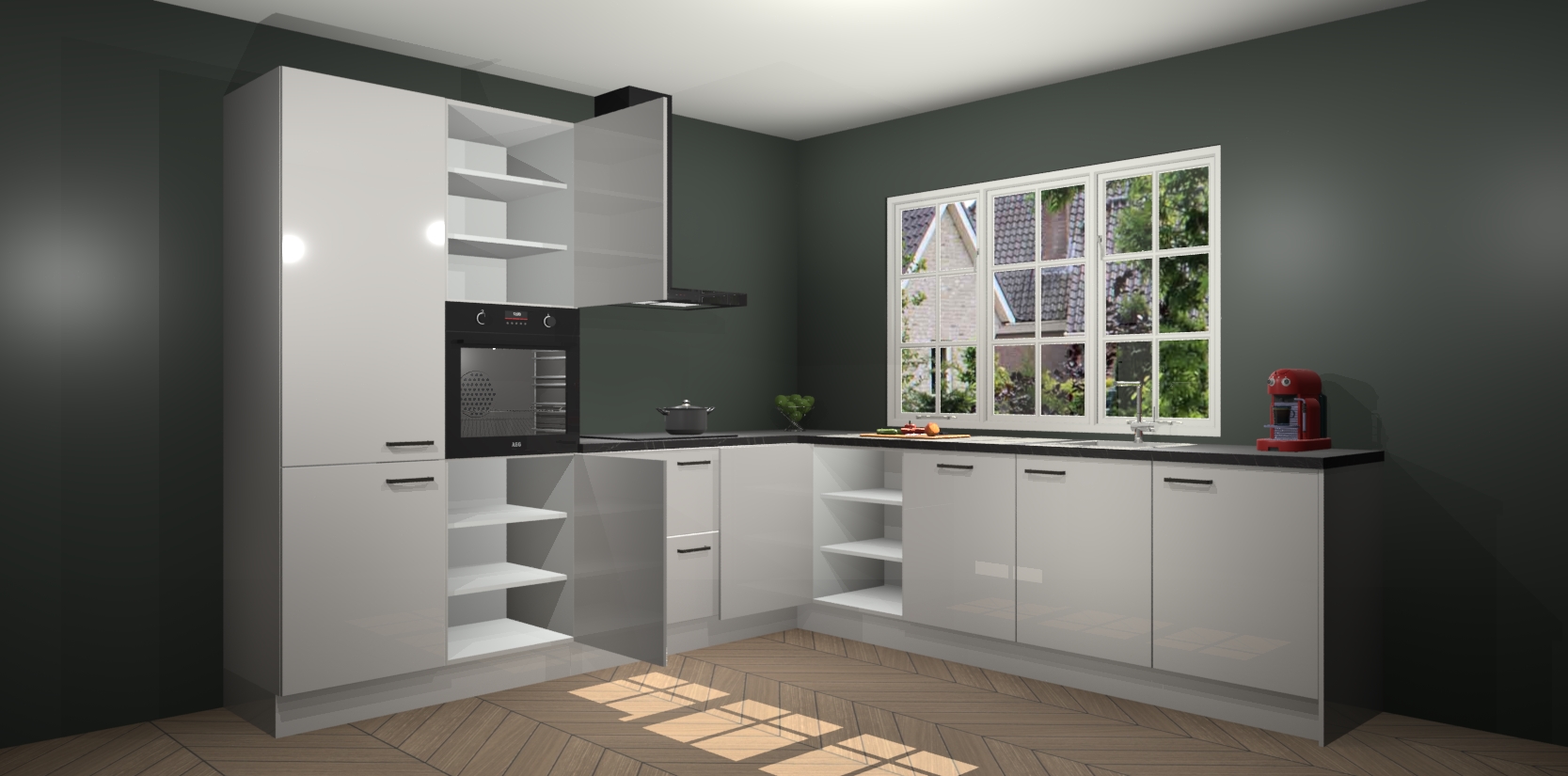 De keuken heeft veel opbergruimte, waardoor u alle ingrediënten gemakkelijk bereikbaar hebt staan. En daarnaast bevat deze volledig uitgeruste keuken ook 5 ingebouwde apparaten: een oven, inductiekookplaat, afzuigkap, vaatwasser en koelkast. Deze zijn heel eenvoudig na bestellen te upgraden naar AEG als u dit wilt. Bovendien zijn de softclose-kastdeuren ideaal; geef ze gewoon even een tikje en ze sluiten automatisch met geruisloze precisie.