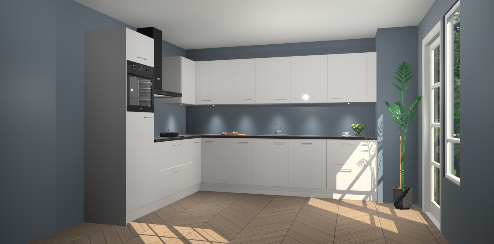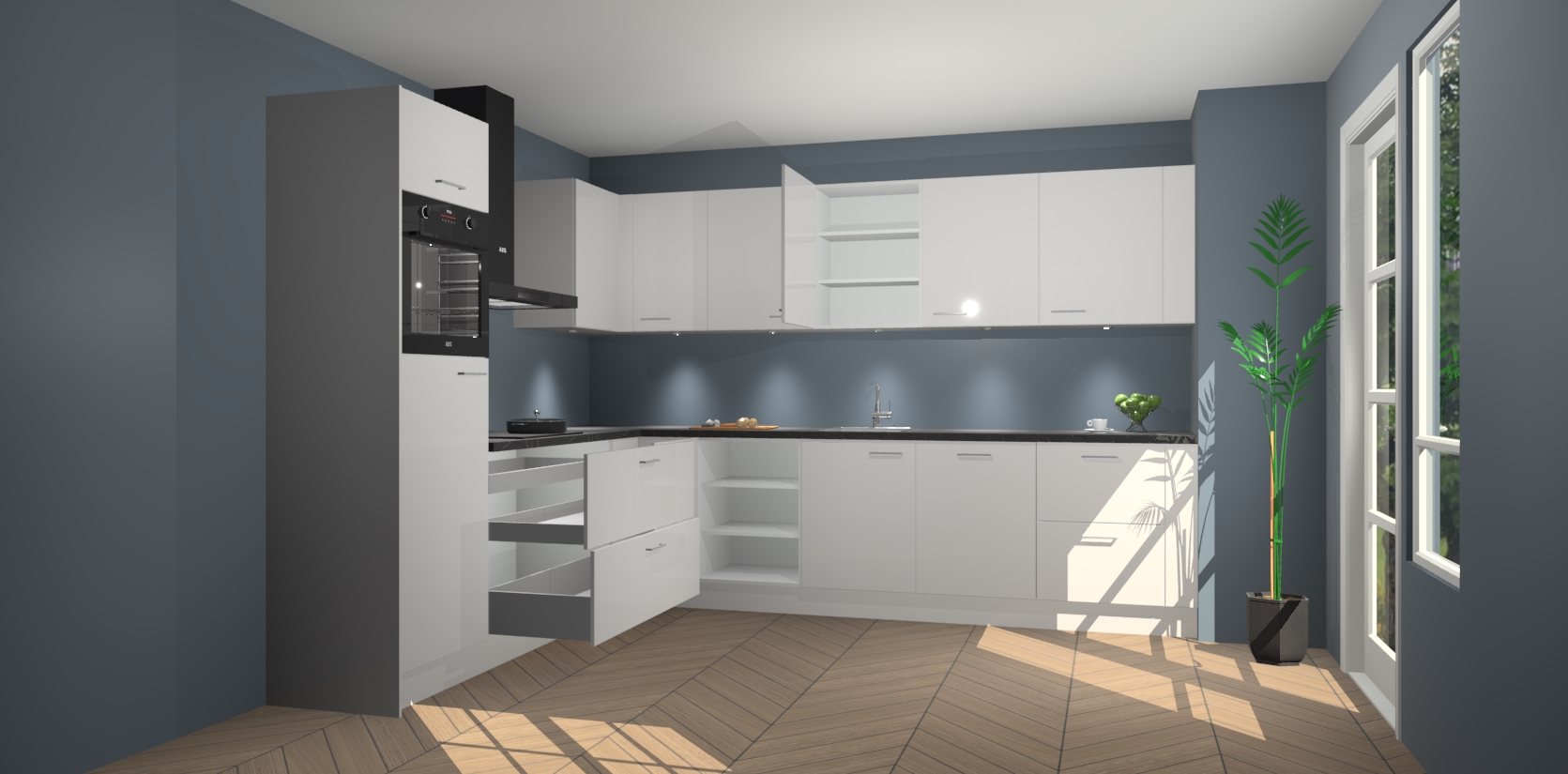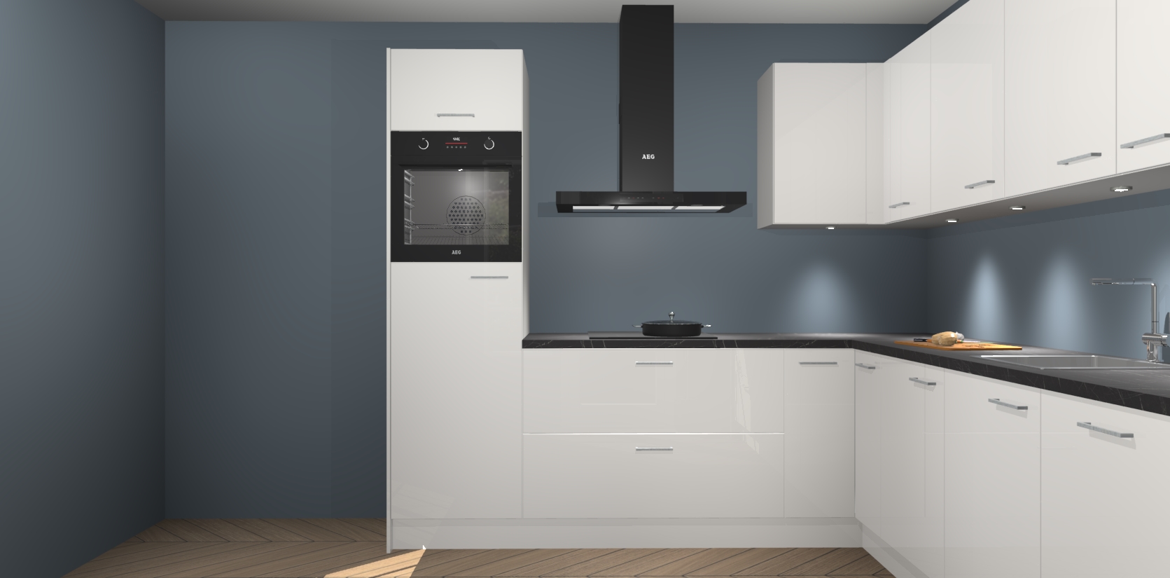 De Zijdegrijze hoogglans keuken Debar is uitgerust met vijf inbouwapparaten die elke kooktaak handig en efficiënt maken. Een oven, inductiekookplaat, afzuigkap, vaatwasser en koelkast zijn standaard, maar kunnen na bestelling eenvoudig worden geupgrade naar AEG. Profiteer vervolgens van de softclose deuren voor snelle toegang en geruisloze toegang.