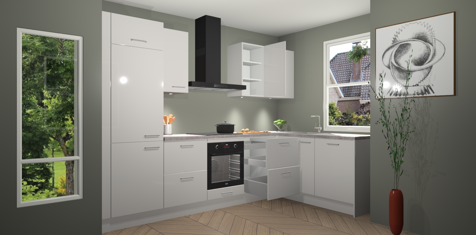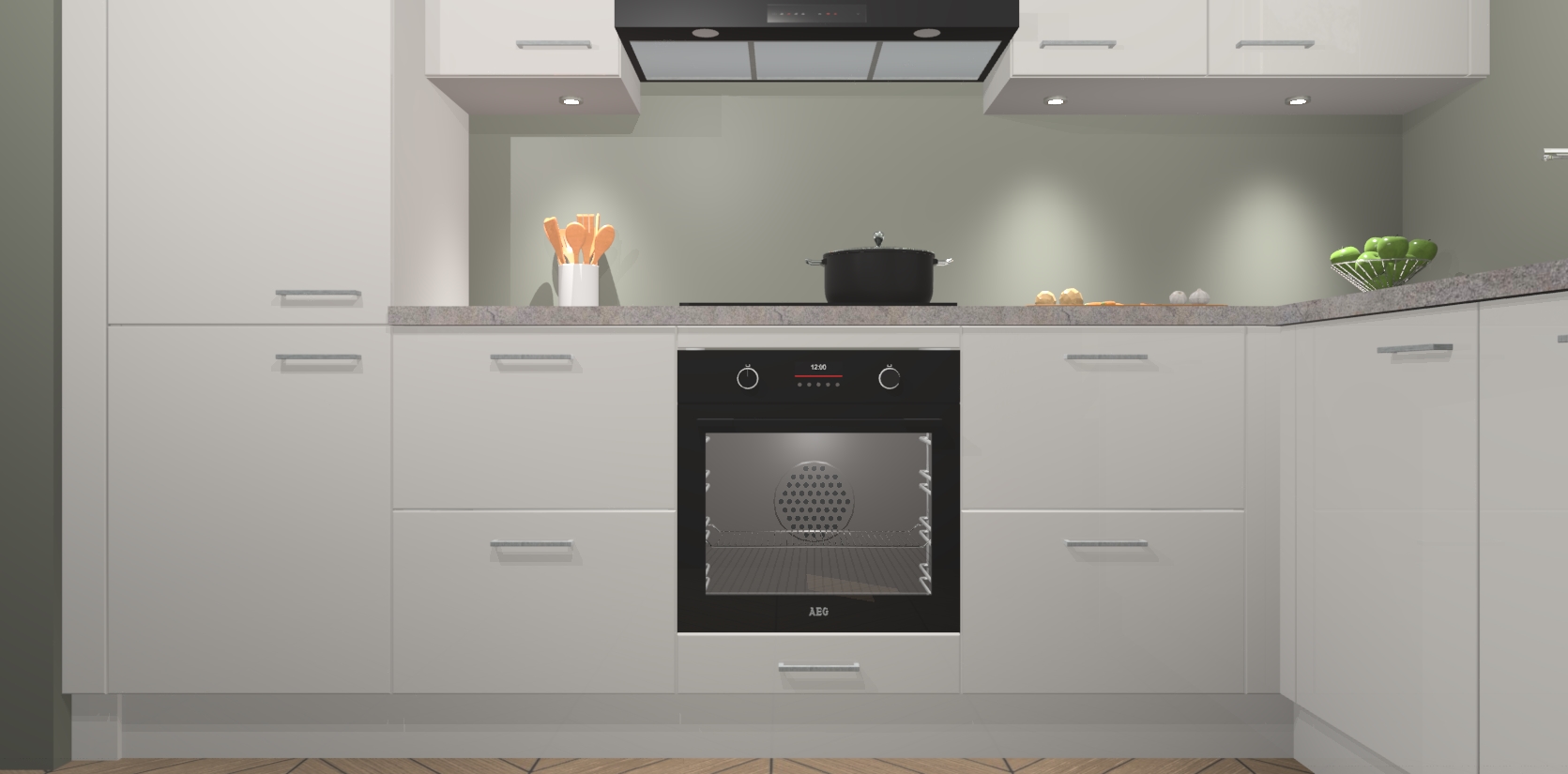 De Zijdegrijze hoogglans keuken Geneve is uitgerust met 5 inbouwapparaten - een oven, inductiekookplaat, afzuigkap, vaatwasser en koelkast - voor al uw kook- en bewaarbehoeftes. U kunt deze apparaten desgewenst eenvoudig upgraden naar AEG of de oven omruilen voor een combimagnetron na het plaatsen van uw bestelling. En met de soft close deuren, voldoende opbergruimte en kasten die voorgemonteerd worden geleverd, bent u in een mum van tijd klaar om heerlijke maaltijden te bereiden!