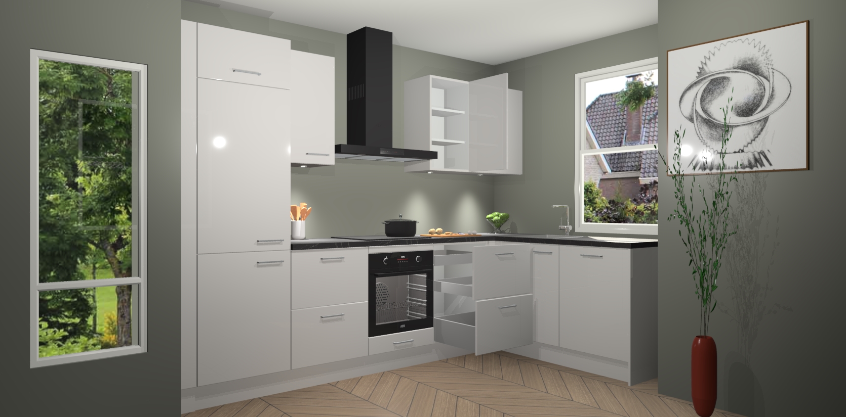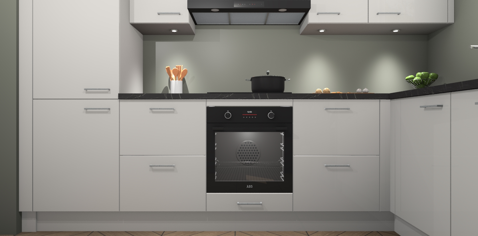 De Zijdegrijze hoogglans keuken Geneve is uitgerust met 5 inbouwapparaten - een oven, inductiekookplaat, afzuigkap, vaatwasser en koelkast - voor al uw kook- en bewaarbehoeftes. U kunt deze apparaten desgewenst eenvoudig upgraden naar AEG of de oven omruilen voor een combimagnetron na het plaatsen van uw bestelling. En met de soft close deuren, voldoende opbergruimte en kasten die voorgemonteerd worden geleverd, bent u in een mum van tijd klaar om heerlijke maaltijden te bereiden!