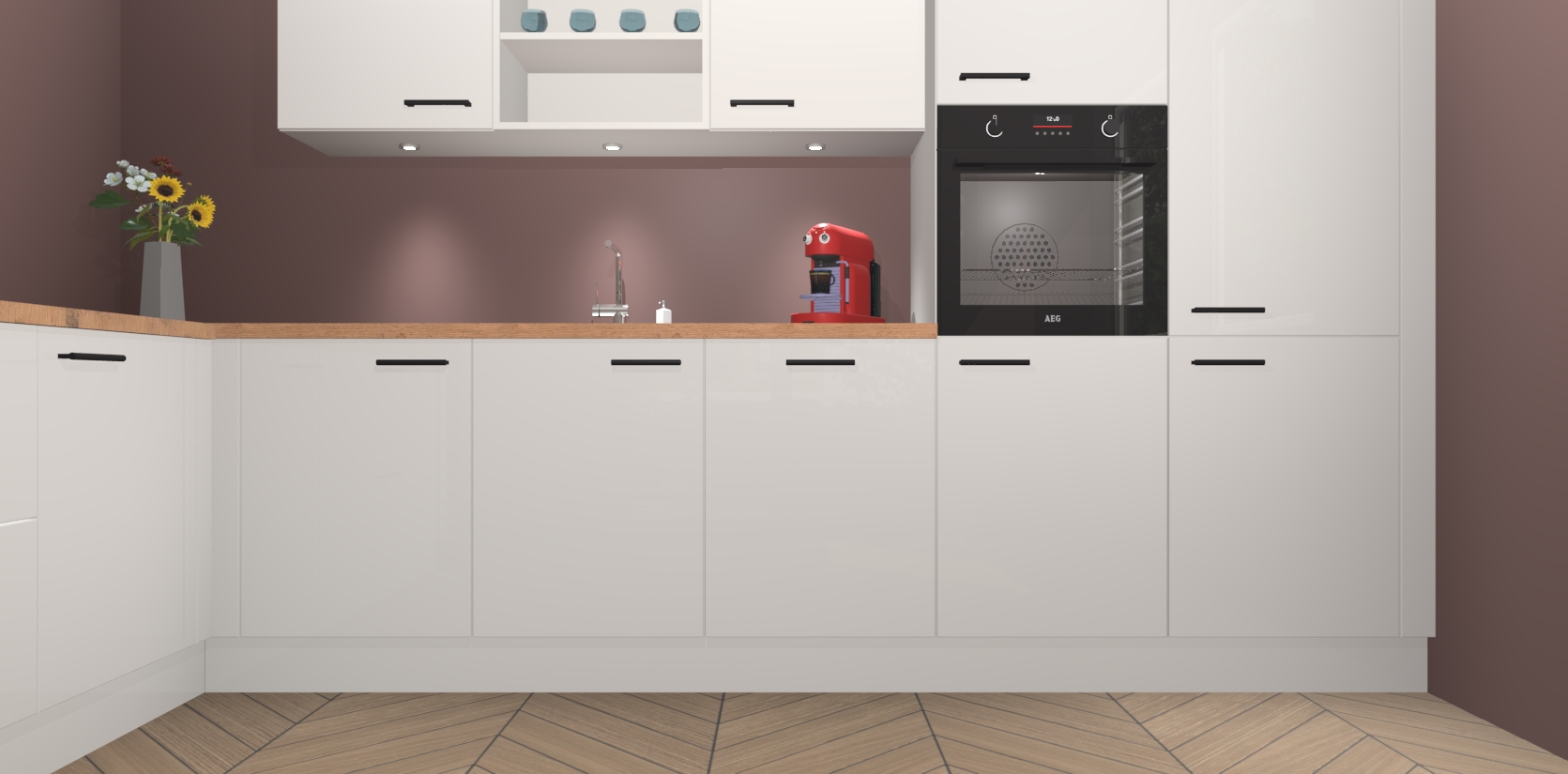 De Zijdegrijze hoogglans keuken Gotenburg is zo ontworpen dat u alle mogelijke vormen van opslagruimte kunt genieten. Bovendien heeft u meteen toegang tot vijf ingebouwde apparaten: een oven, inductiekookplaat, afzuigkap, vaatwasser en koelkast. Gewoon upgraden naar AEG na bestelling? Dit kan heel gemakkelijk worden geregeld. De deuren sluiten zacht dankzij zachtsluitende scharnieren en ze houden warmte vast terwijl ze uitzonderlijk stil blijven wanneer ze worden geopend of gesloten.