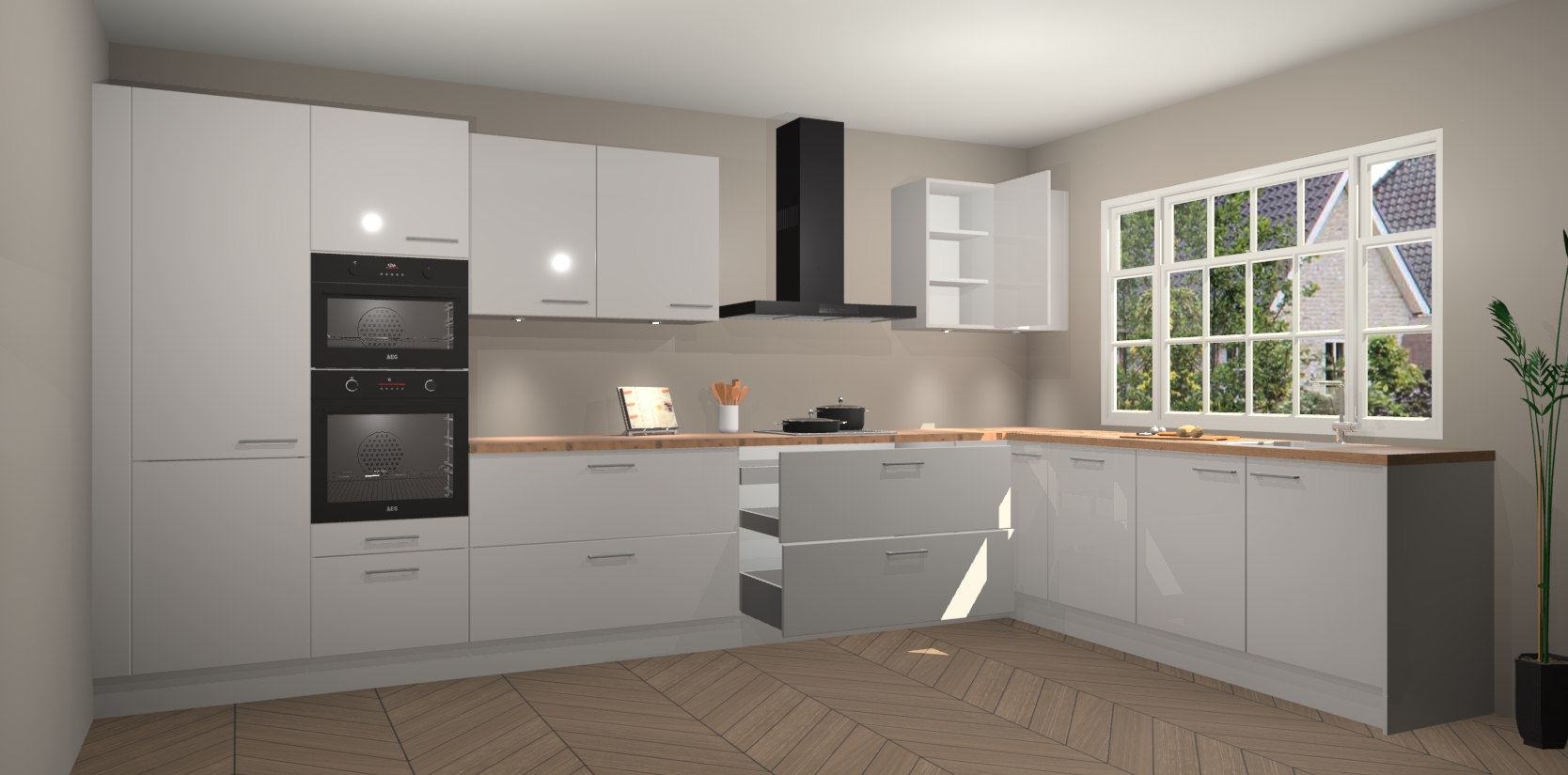 Kom dichtbij de perfecte keuken van uw dromen met de zijdegrijze hoogglans keuken Graz. Met een prachtige houtlook en eigentijds ontwerp, straalt deze keuken warmte en sfeer uit. Of u nu liefhebber bent van traditionele of moderne stijlen, er is genoeg ruimte om aan al uw behoeften te voldoen.