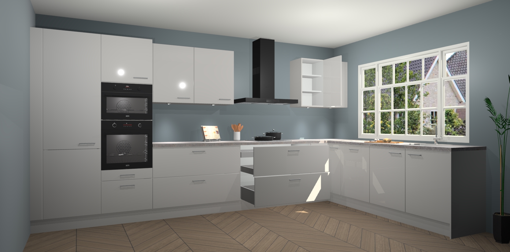 Kom dichtbij de perfecte keuken van uw dromen met de zijdegrijze hoogglans keuken Graz. Met een prachtige houtlook en eigentijds ontwerp, straalt deze keuken warmte en sfeer uit. Of u nu liefhebber bent van traditionele of moderne stijlen, er is genoeg ruimte om aan al uw behoeften te voldoen.