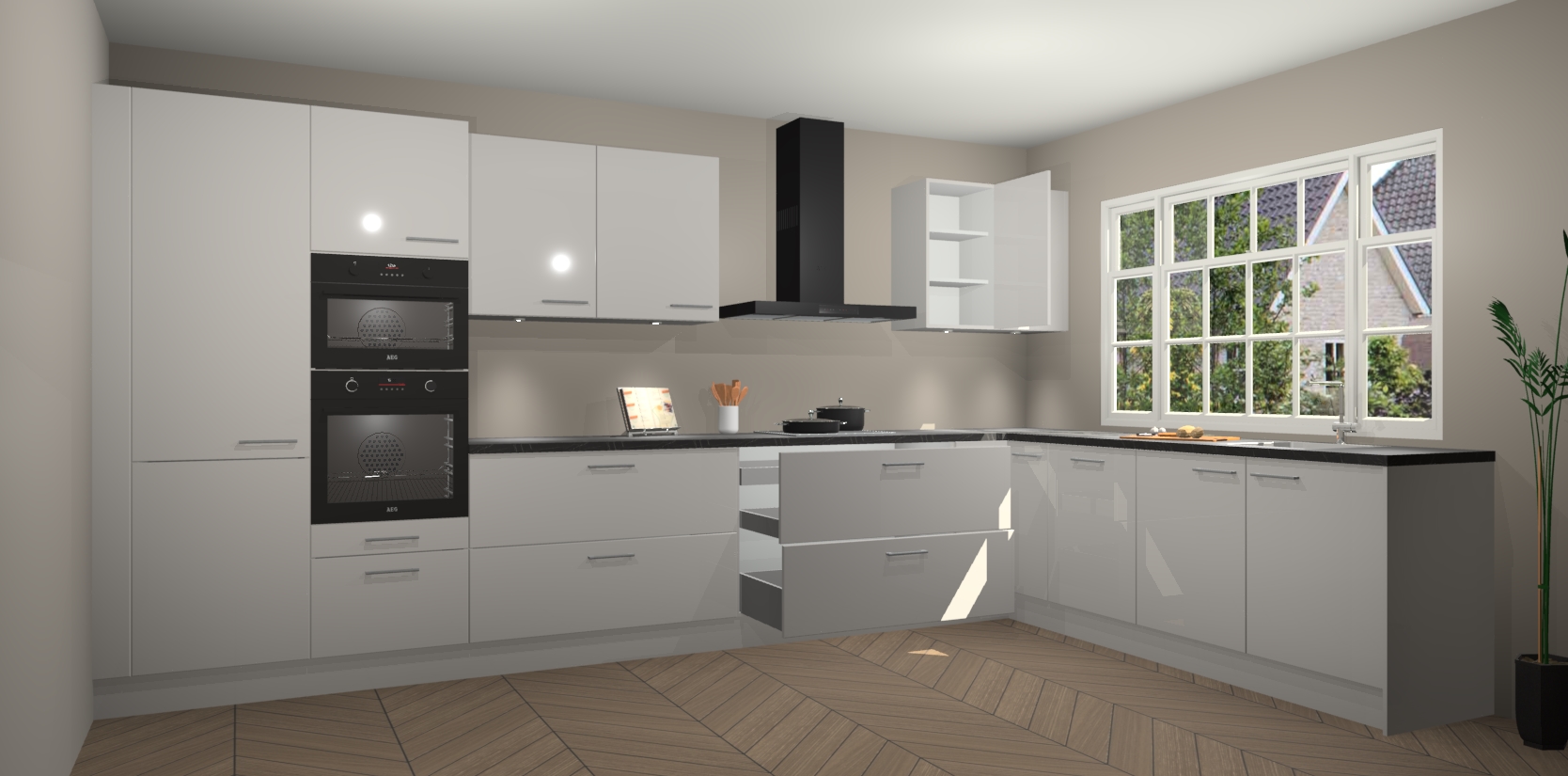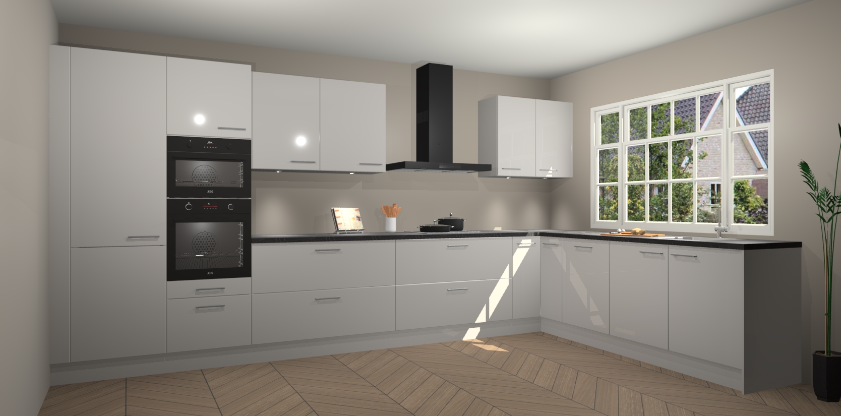 Kom dichtbij de perfecte keuken van uw dromen met de zijdegrijze hoogglans keuken Graz. Met een prachtige houtlook en eigentijds ontwerp, straalt deze keuken warmte en sfeer uit. Of u nu liefhebber bent van traditionele of moderne stijlen, er is genoeg ruimte om aan al uw behoeften te voldoen.