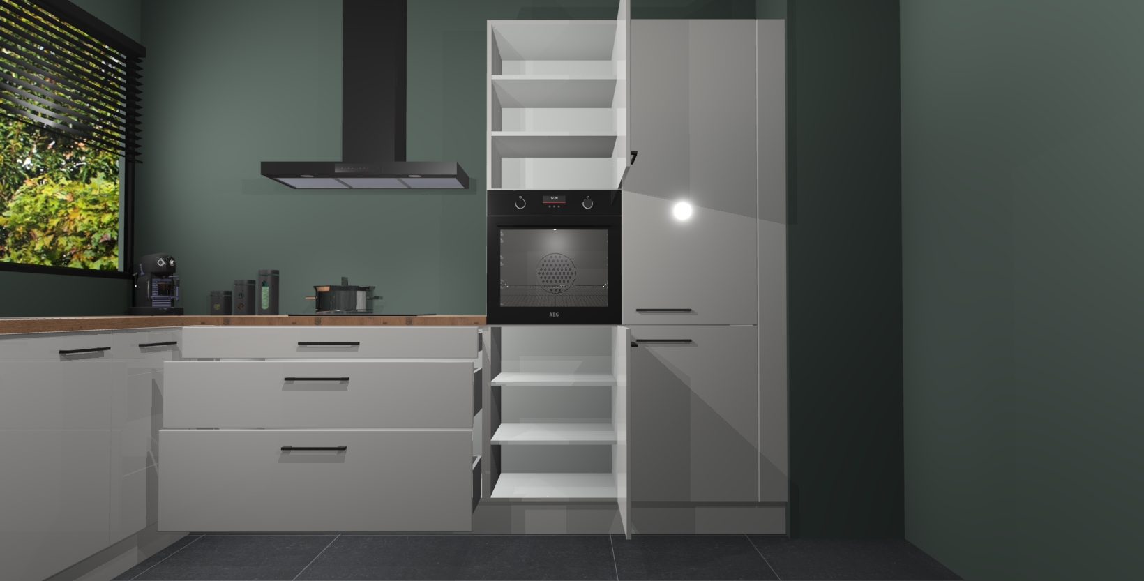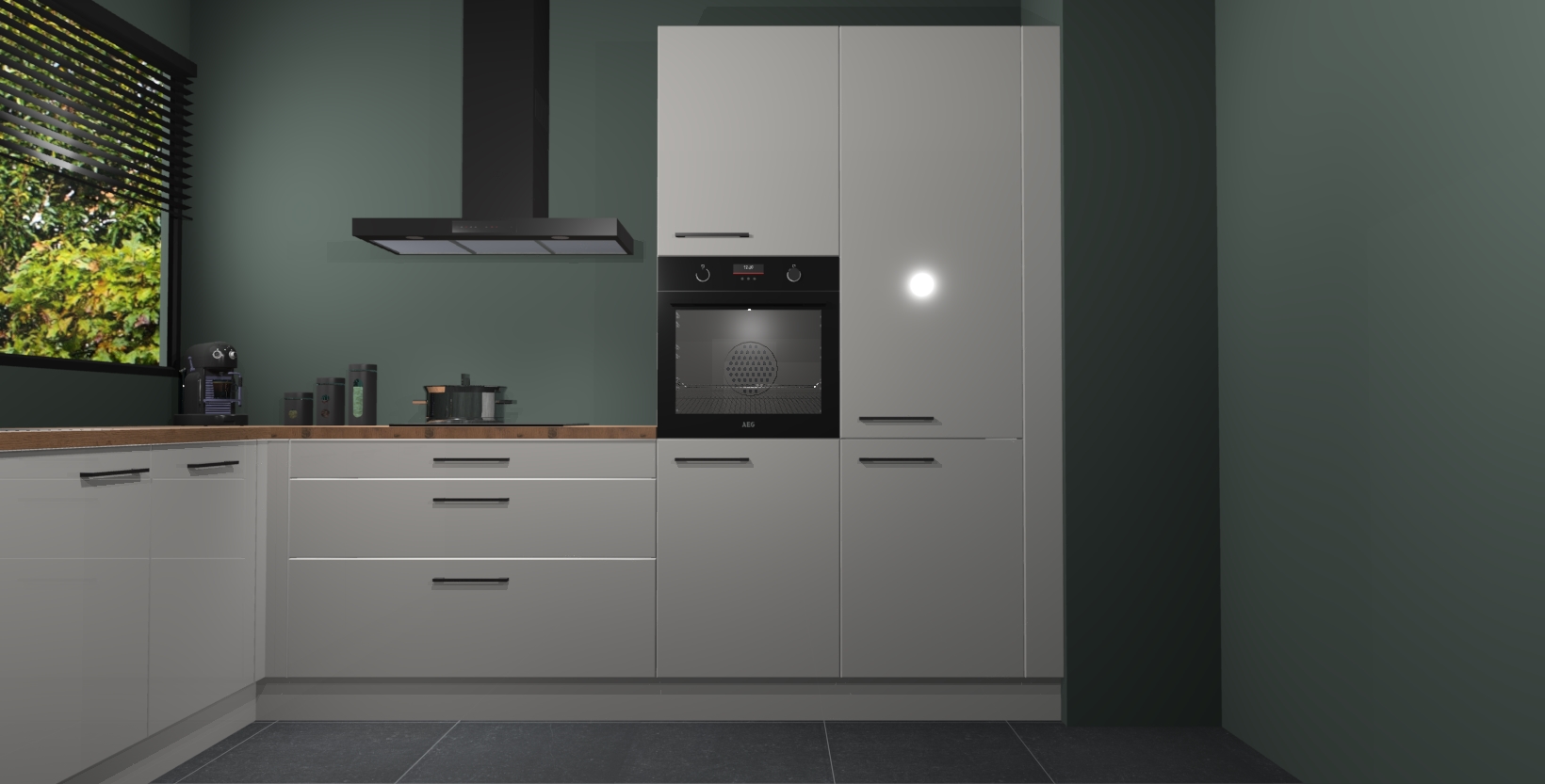 Met een modern, tijdloos design en ruime opslagruimte, zult u zich in no-time thuis voelen in uw nieuwe keuken. Uw leven wordt eenvoudiger met de soft-close deuren die voor het ultieme stille comfort zorgen - geen geluid dat u stoort terwijl u kookt. Ook is de keuken voorzien van 5 ingebouwde apparaten: een oven, inductie kookplaat, afzuigkap, vaatwasser en koelkast. Deze kunnen gemakkelijk na bestelling worden bijgewerkt naar AEG - waardoor uw luxe ervaring compleet is.