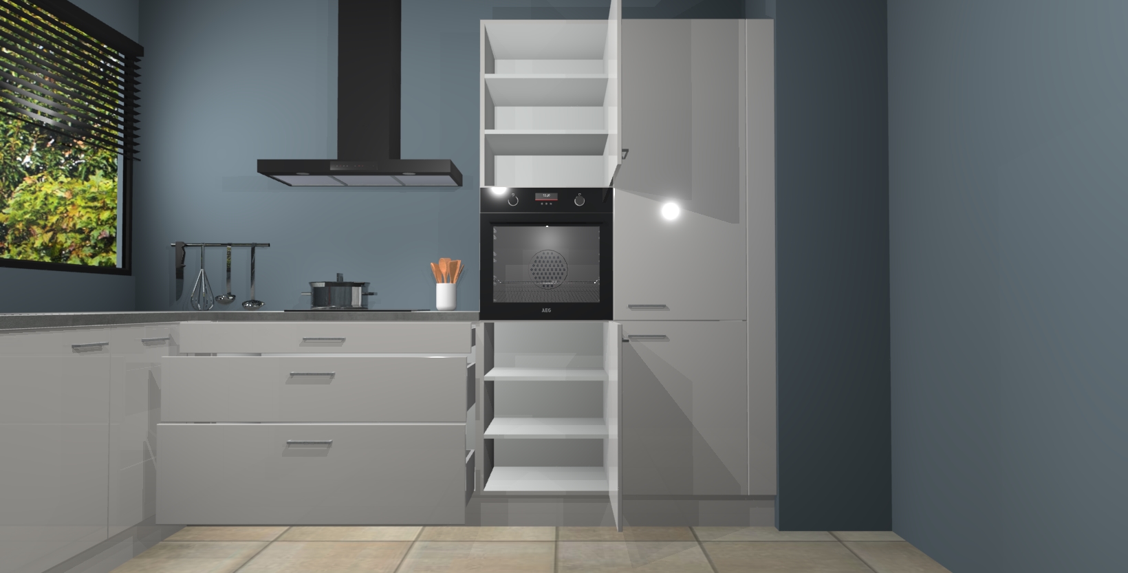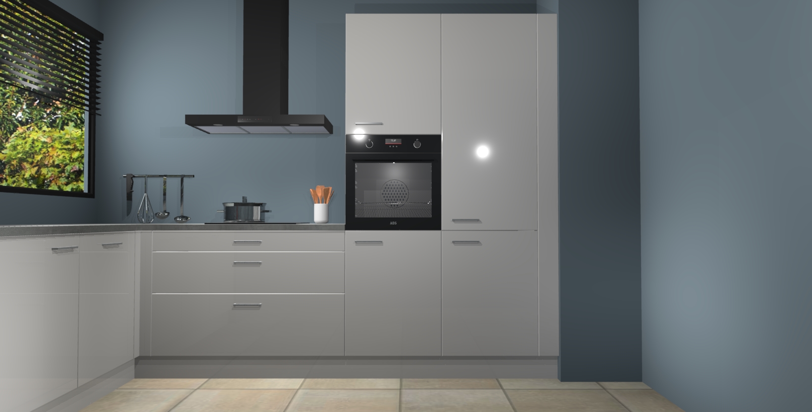 Met een modern, tijdloos design en ruime opslagruimte, zult u zich in no-time thuis voelen in uw nieuwe keuken. Uw leven wordt eenvoudiger met de soft-close deuren die voor het ultieme stille comfort zorgen - geen geluid dat u stoort terwijl u kookt. Ook is de keuken voorzien van 5 ingebouwde apparaten: een oven, inductie kookplaat, afzuigkap, vaatwasser en koelkast. Deze kunnen gemakkelijk na bestelling worden bijgewerkt naar AEG - waardoor uw luxe ervaring compleet is.