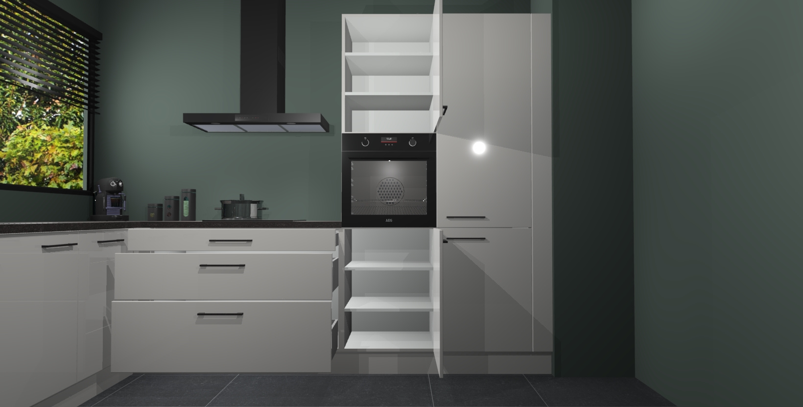 Met een modern, tijdloos design en ruime opslagruimte, zult u zich in no-time thuis voelen in uw nieuwe keuken. Uw leven wordt eenvoudiger met de soft-close deuren die voor het ultieme stille comfort zorgen - geen geluid dat u stoort terwijl u kookt. Ook is de keuken voorzien van 5 ingebouwde apparaten: een oven, inductie kookplaat, afzuigkap, vaatwasser en koelkast. Deze kunnen gemakkelijk na bestelling worden bijgewerkt naar AEG - waardoor uw luxe ervaring compleet is.
