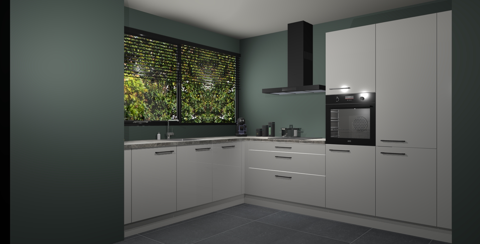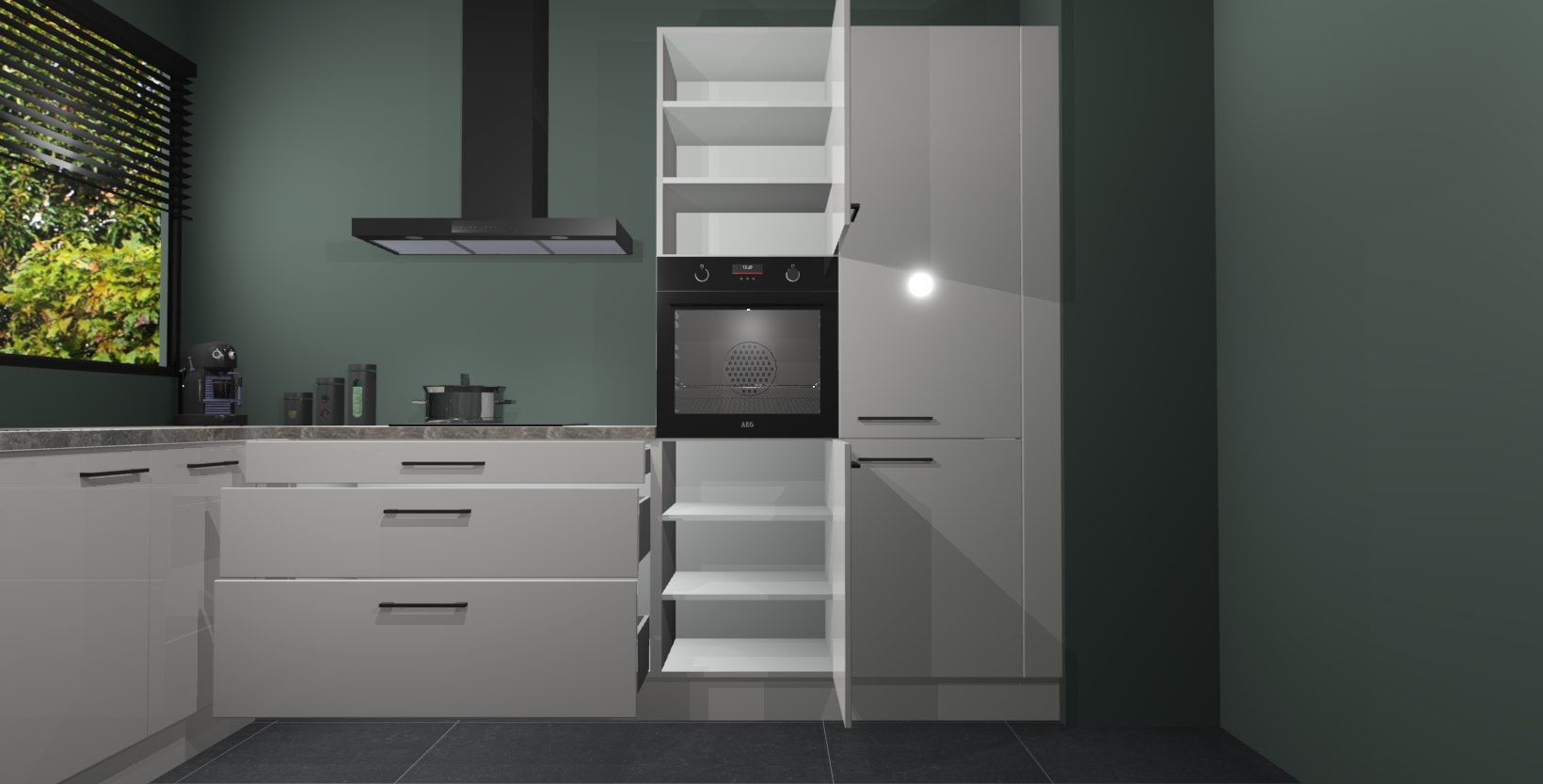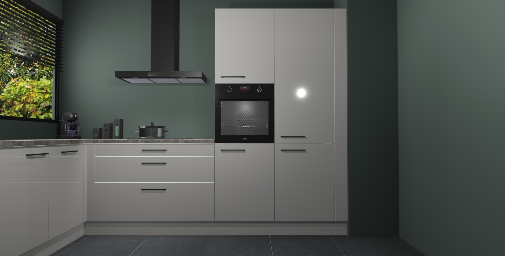Met een modern, tijdloos design en ruime opslagruimte, zult u zich in no-time thuis voelen in uw nieuwe keuken. Uw leven wordt eenvoudiger met de soft-close deuren die voor het ultieme stille comfort zorgen - geen geluid dat u stoort terwijl u kookt. Ook is de keuken voorzien van 5 ingebouwde apparaten: een oven, inductie kookplaat, afzuigkap, vaatwasser en koelkast. Deze kunnen gemakkelijk na bestelling worden bijgewerkt naar AEG - waardoor uw luxe ervaring compleet is.