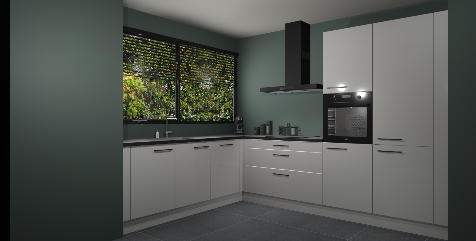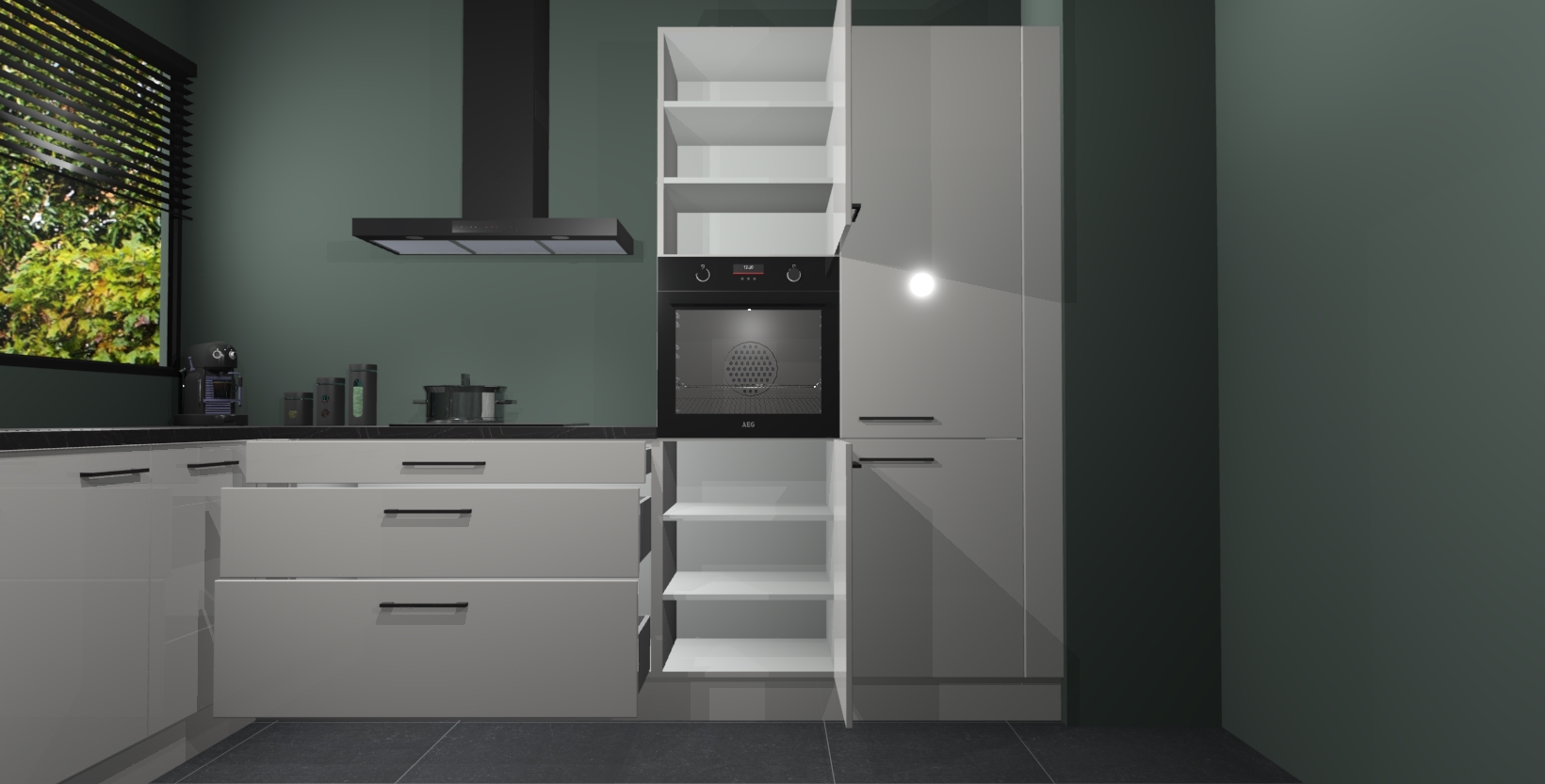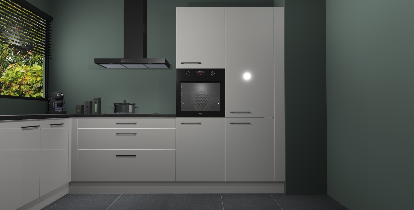 Met een modern, tijdloos design en ruime opslagruimte, zult u zich in no-time thuis voelen in uw nieuwe keuken. Uw leven wordt eenvoudiger met de soft-close deuren die voor het ultieme stille comfort zorgen - geen geluid dat u stoort terwijl u kookt. Ook is de keuken voorzien van 5 ingebouwde apparaten: een oven, inductie kookplaat, afzuigkap, vaatwasser en koelkast. Deze kunnen gemakkelijk na bestelling worden bijgewerkt naar AEG - waardoor uw luxe ervaring compleet is.