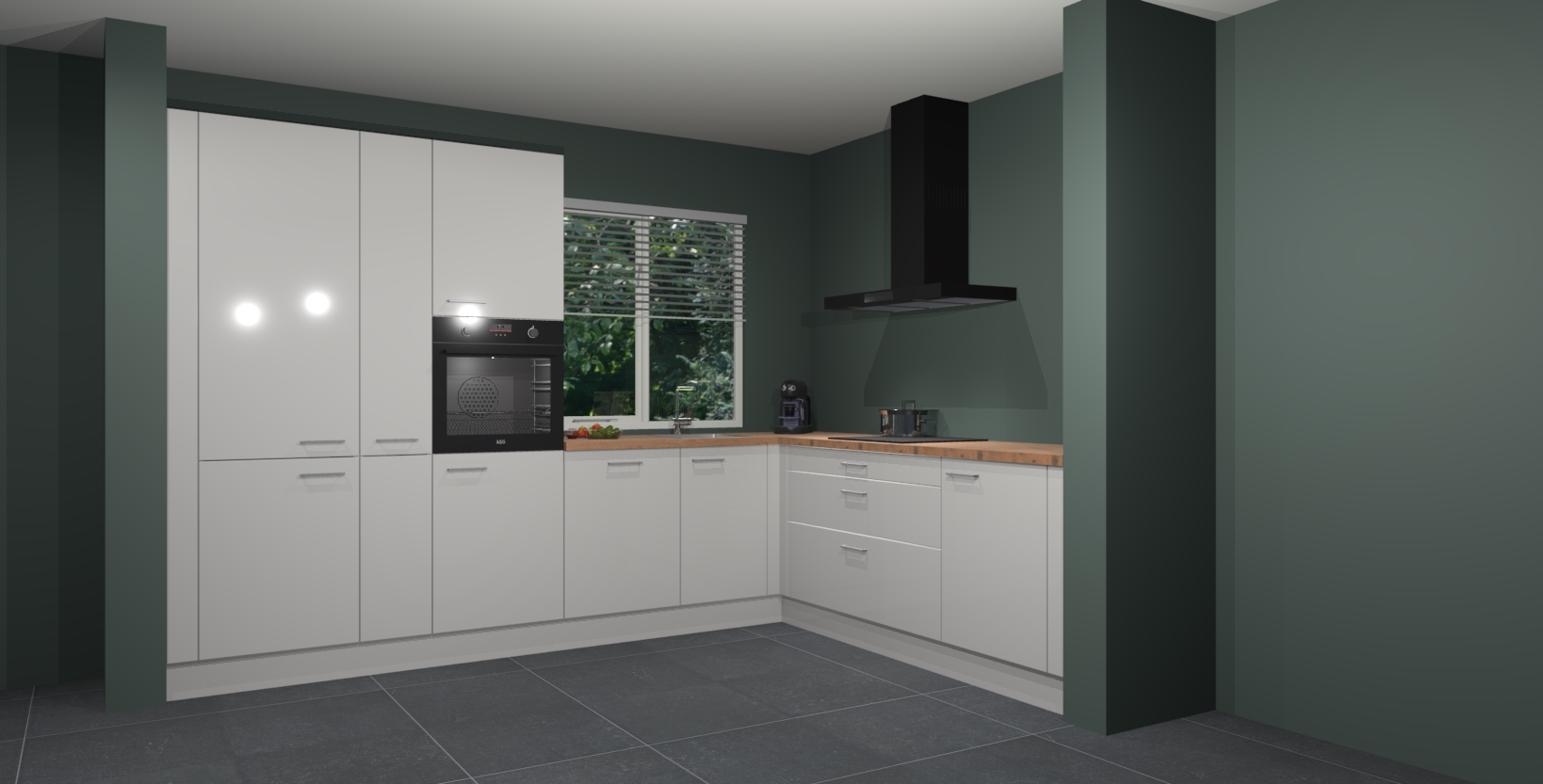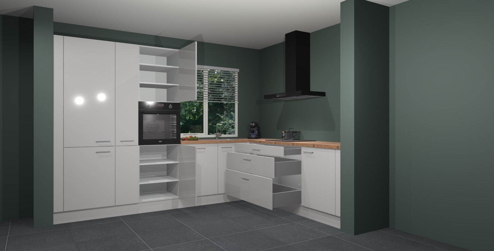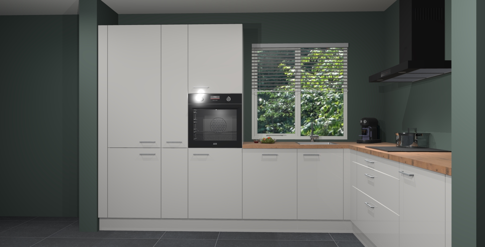 Met een modern, tijdloos design en ruime opslagruimte, zult u zich in no-time thuis voelen in uw nieuwe keuken. Uw leven wordt eenvoudiger met de soft-close deuren die voor het ultieme stille comfort zorgen - geen geluid dat u stoort terwijl u kookt. Ook is de keuken voorzien van 5 ingebouwde apparaten: een oven, inductie kookplaat, afzuigkap, vaatwasser en koelkast. Deze kunnen gemakkelijk na bestelling worden bijgewerkt naar AEG - waardoor uw luxe ervaring compleet is.