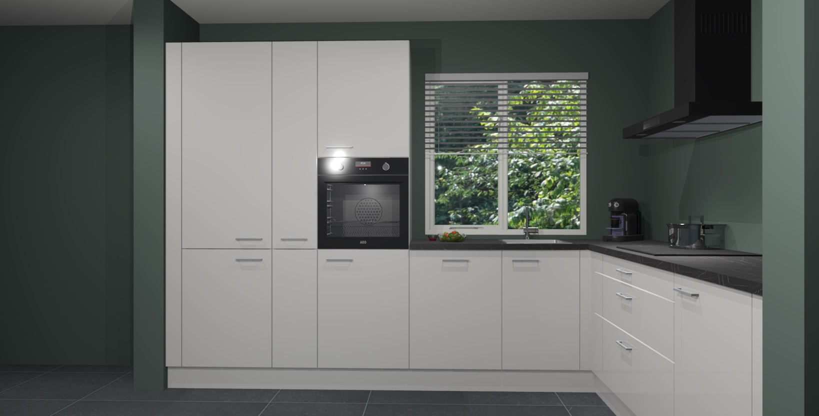 Met een modern, tijdloos design en ruime opslagruimte, zult u zich in no-time thuis voelen in uw nieuwe keuken. Uw leven wordt eenvoudiger met de soft-close deuren die voor het ultieme stille comfort zorgen - geen geluid dat u stoort terwijl u kookt. Ook is de keuken voorzien van 5 ingebouwde apparaten: een oven, inductie kookplaat, afzuigkap, vaatwasser en koelkast. Deze kunnen gemakkelijk na bestelling worden bijgewerkt naar AEG - waardoor uw luxe ervaring compleet is.