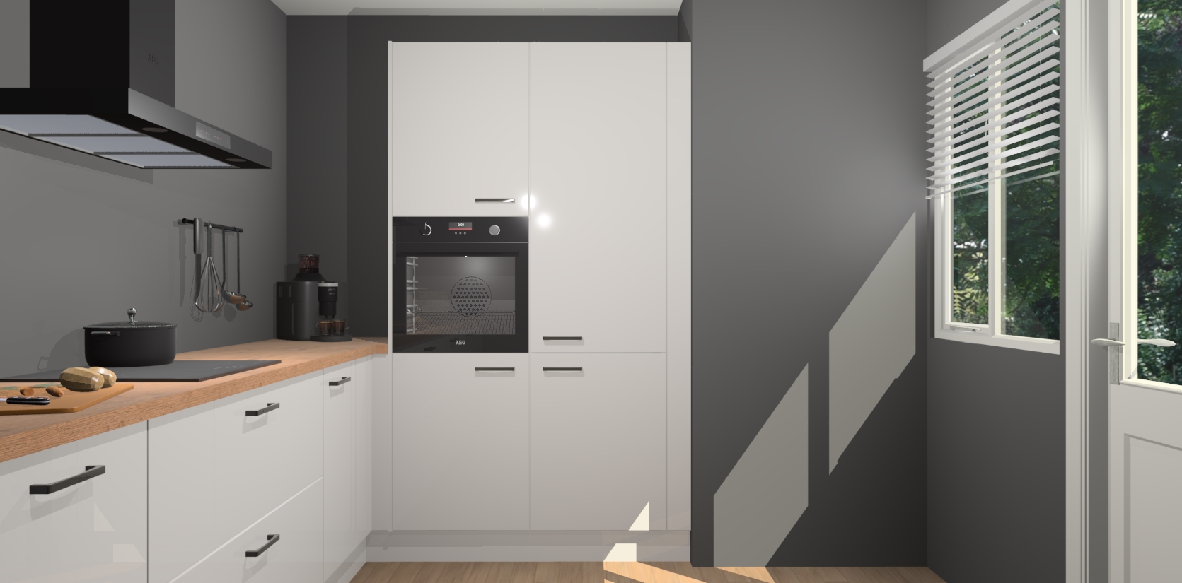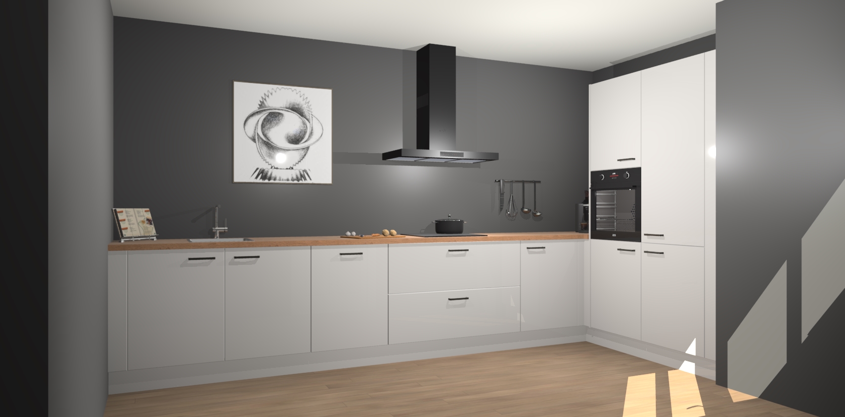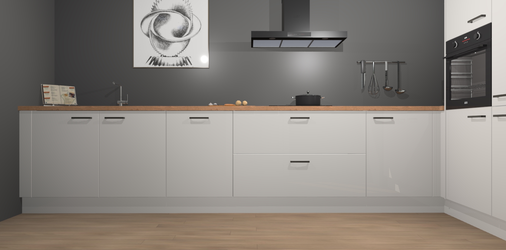 Welkom bij de Zijdegrijze hoogglans keuken Khao Lak. Deze prachtige keuken zal de komende jaren het middelpunt van de belangstelling in uw huis zijn. Uitgerust met vijf inbouwapparaten komt u nooit kookgereedschap tekort. Bovendien geeft de warme houtlook elke ruimte een uitnodigende en tijdloze uitstraling.